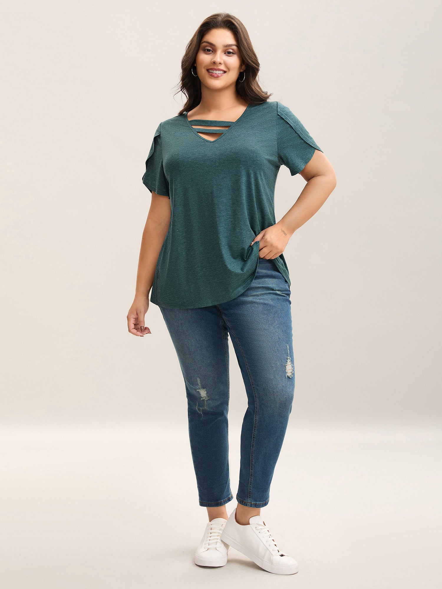 Heather Stretchy Neck Cut-Out T-Shirt