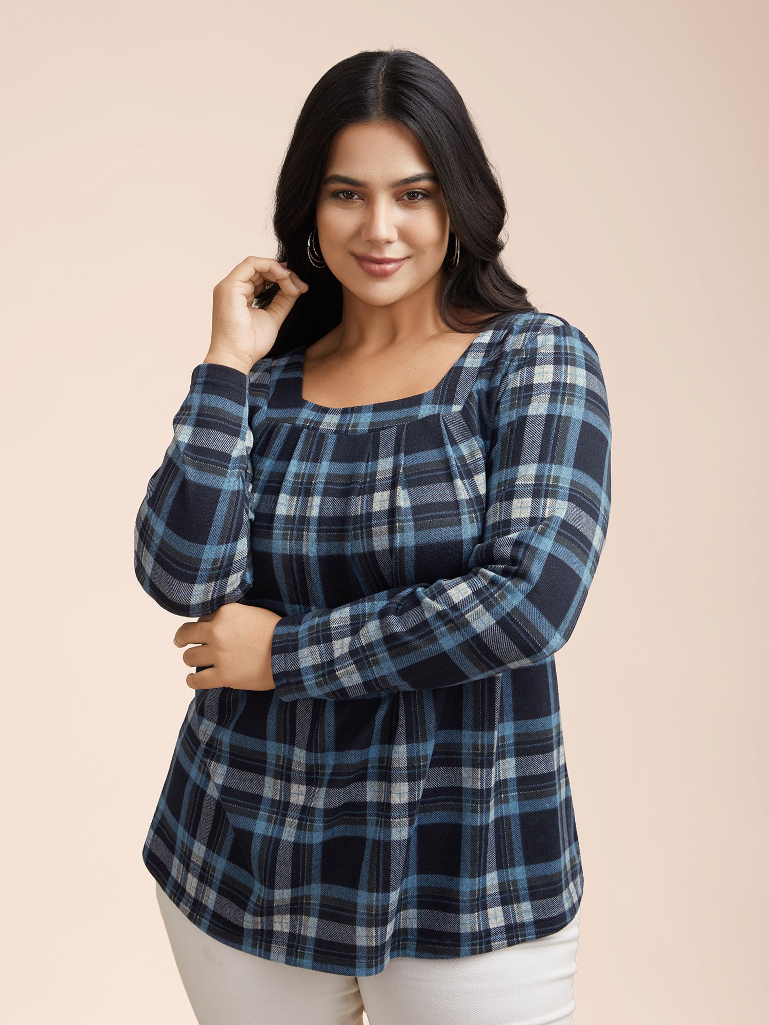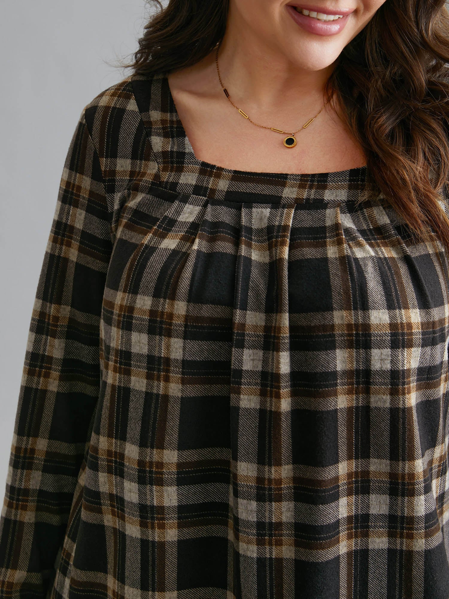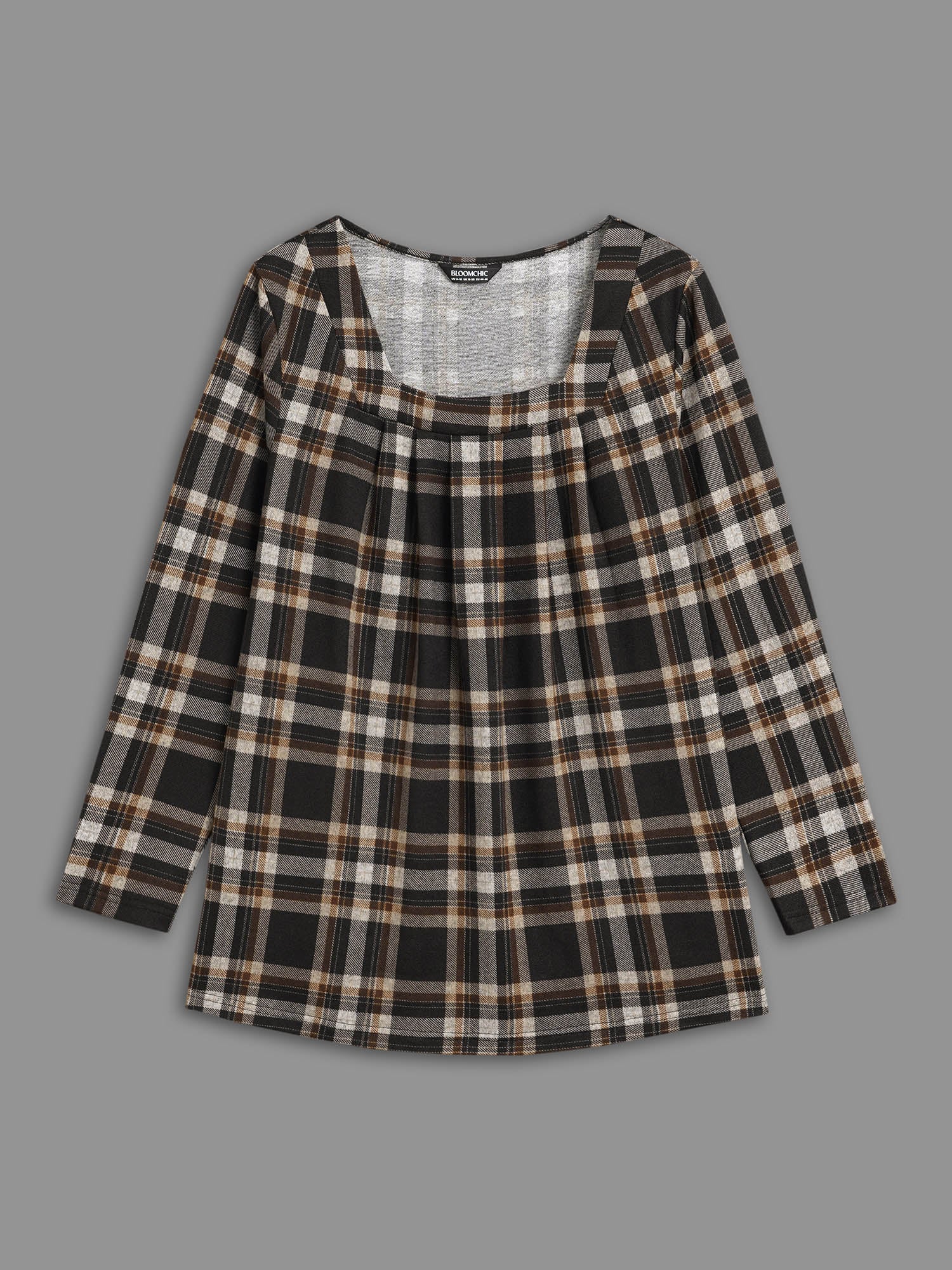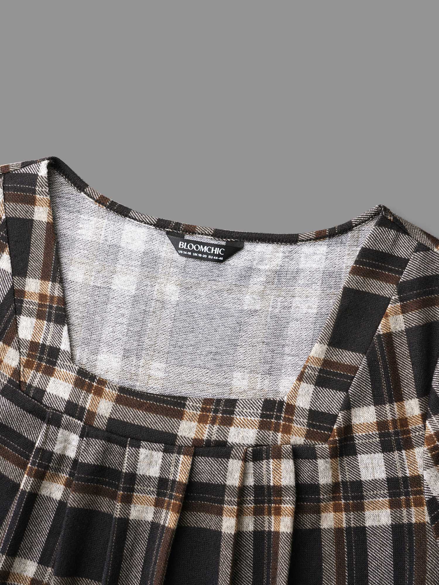 Plaid Pleated Square Neckline Knit Top
