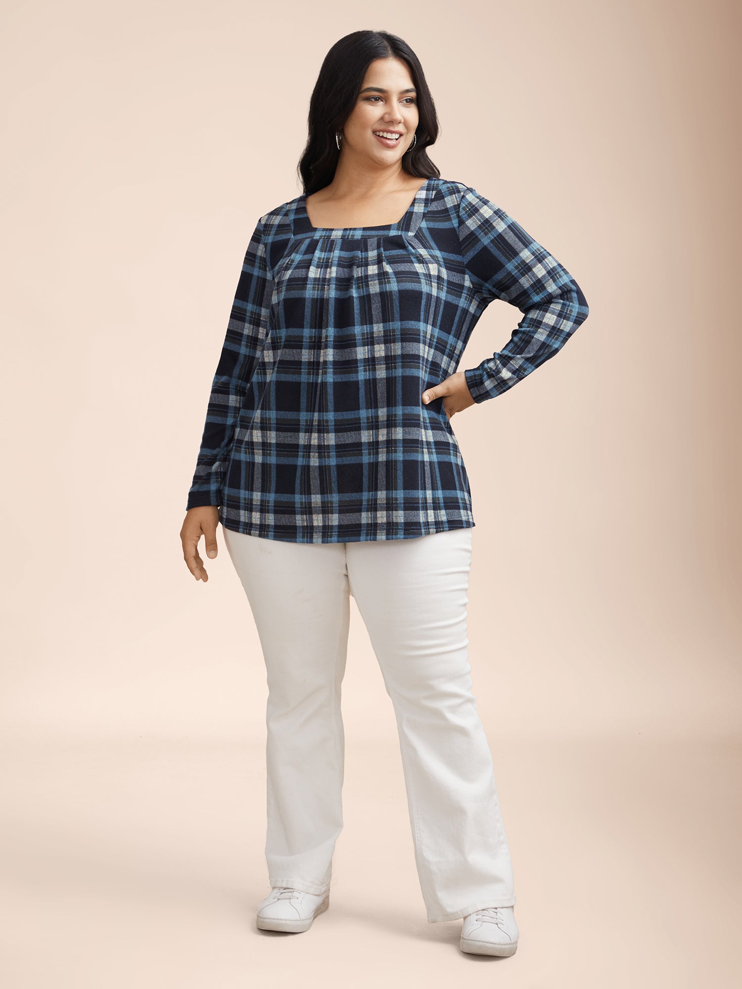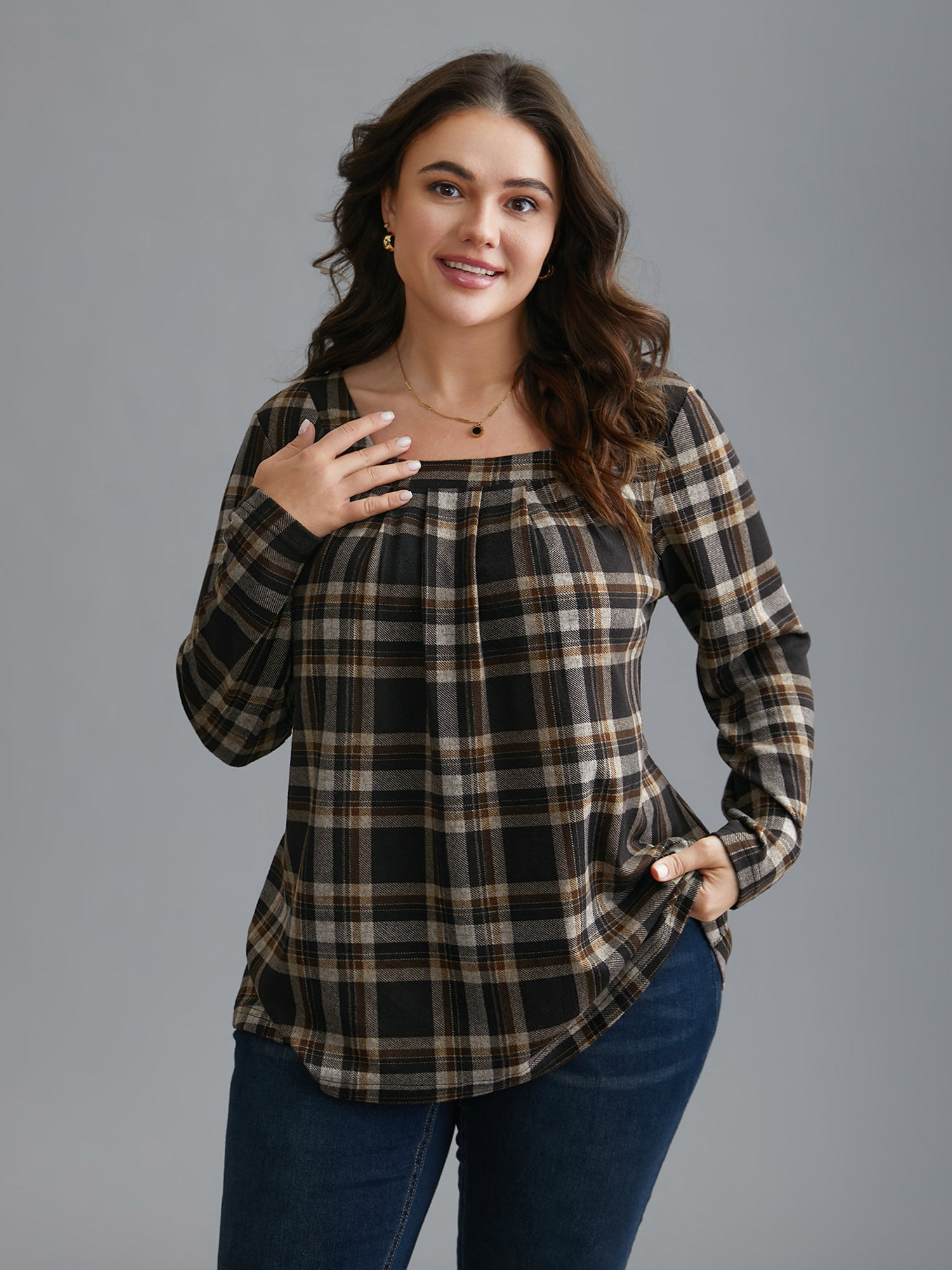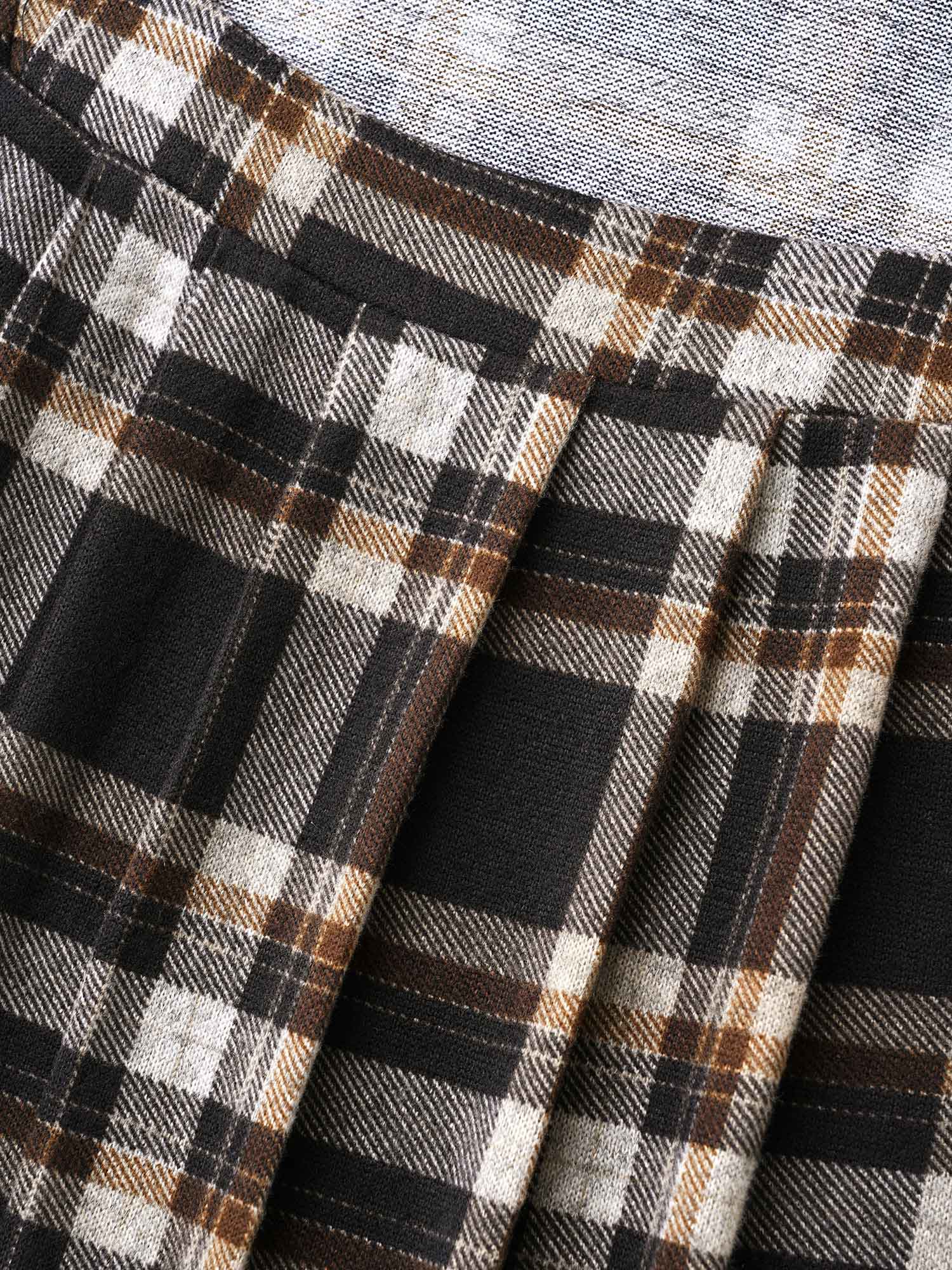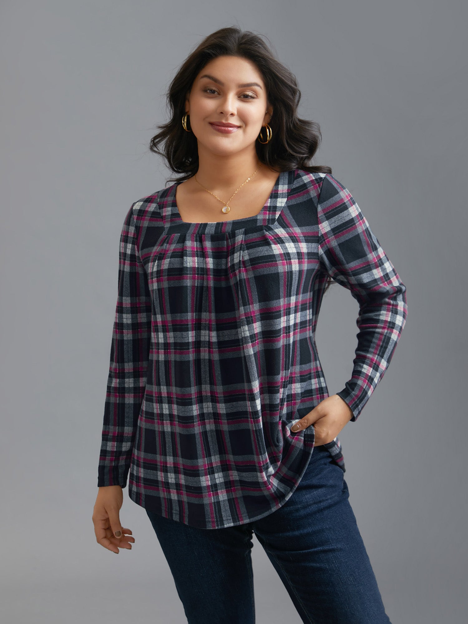 Plaid Pleated Square Neckline Knit Top