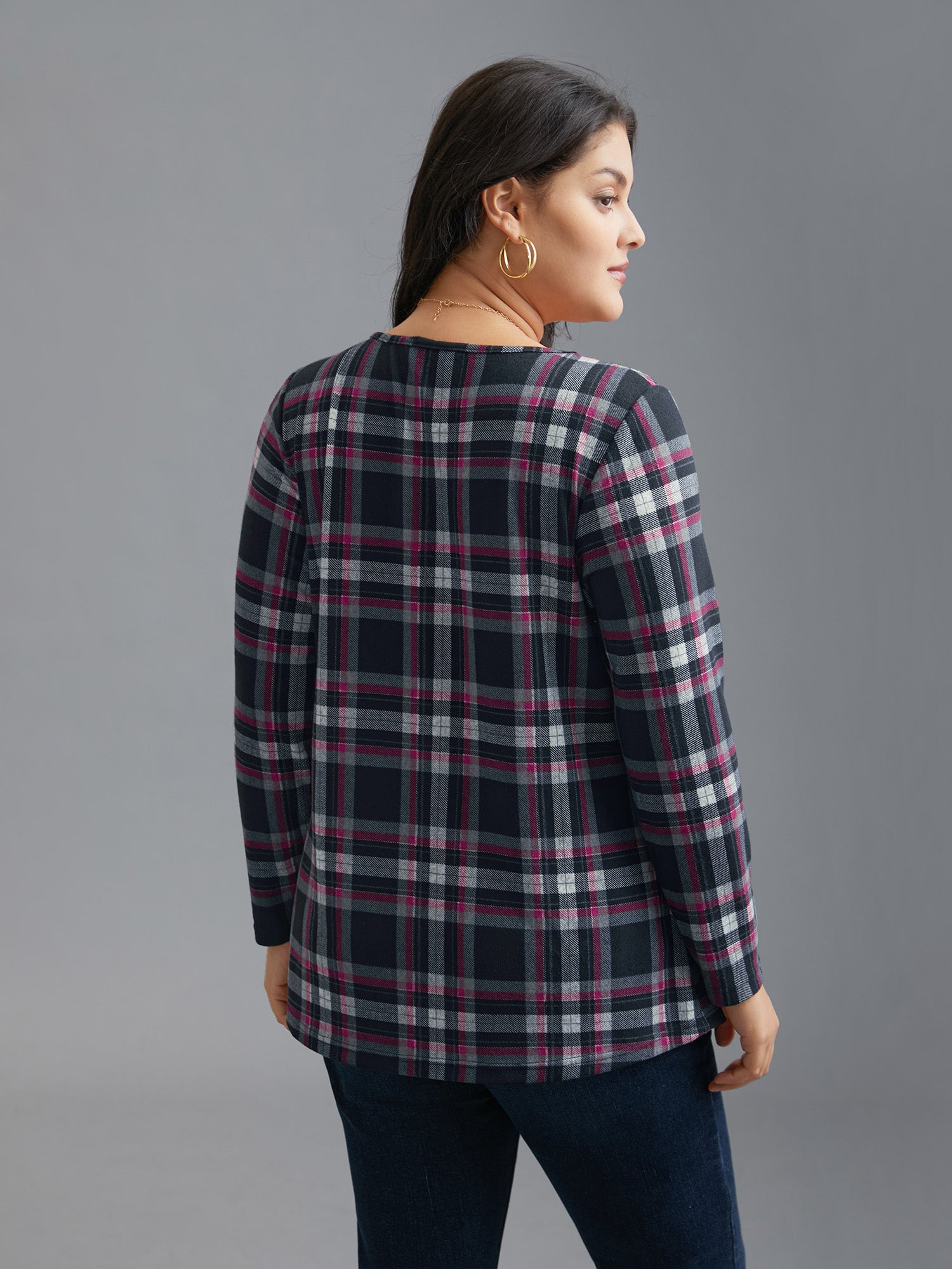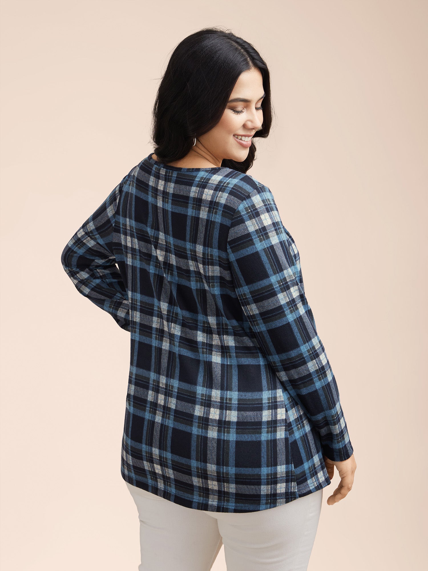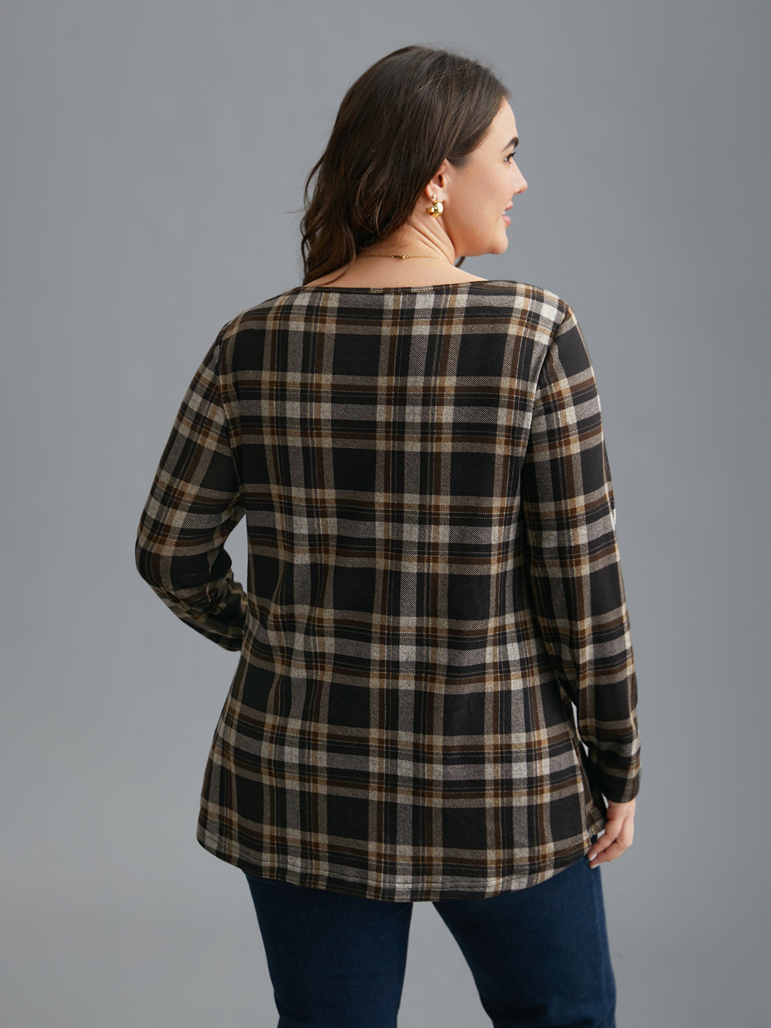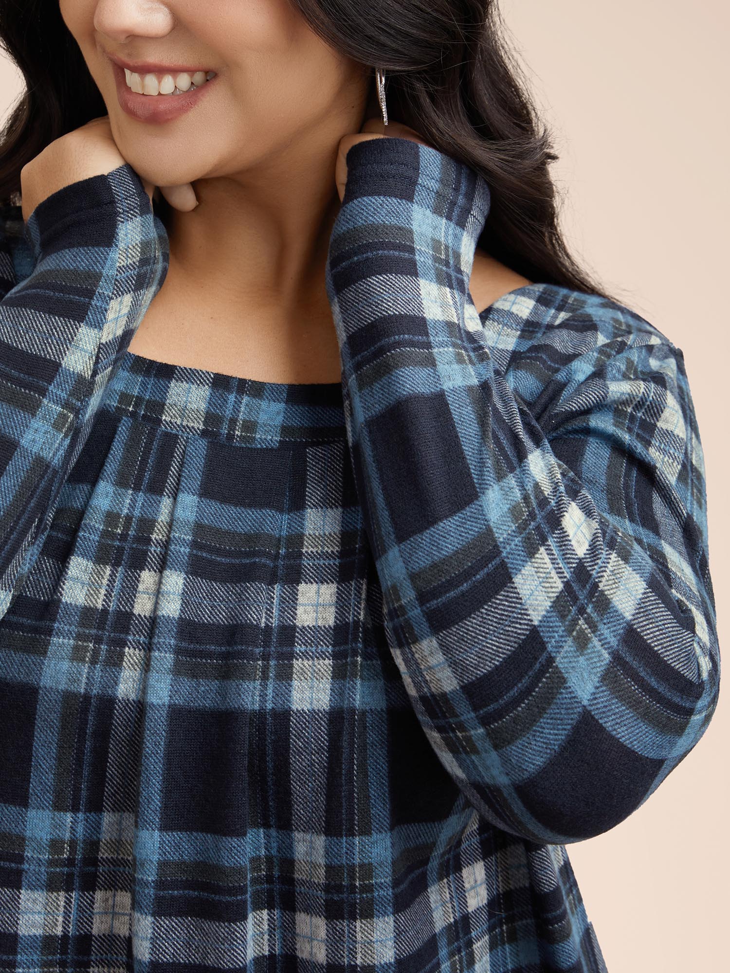 Plaid Pleated Square Neckline Knit Top
