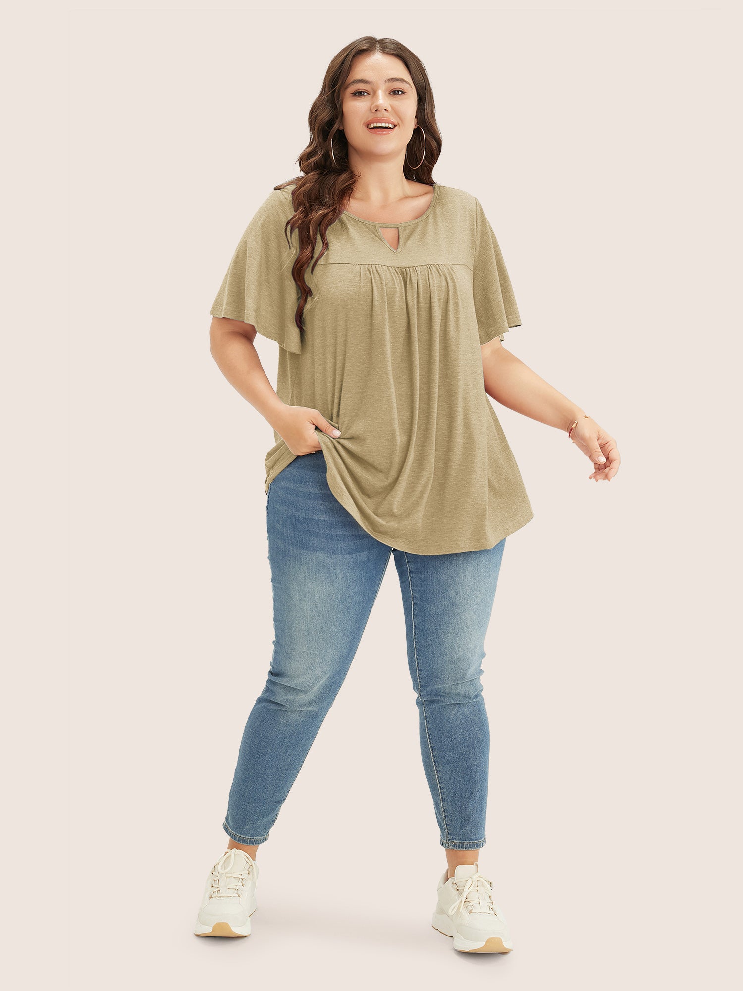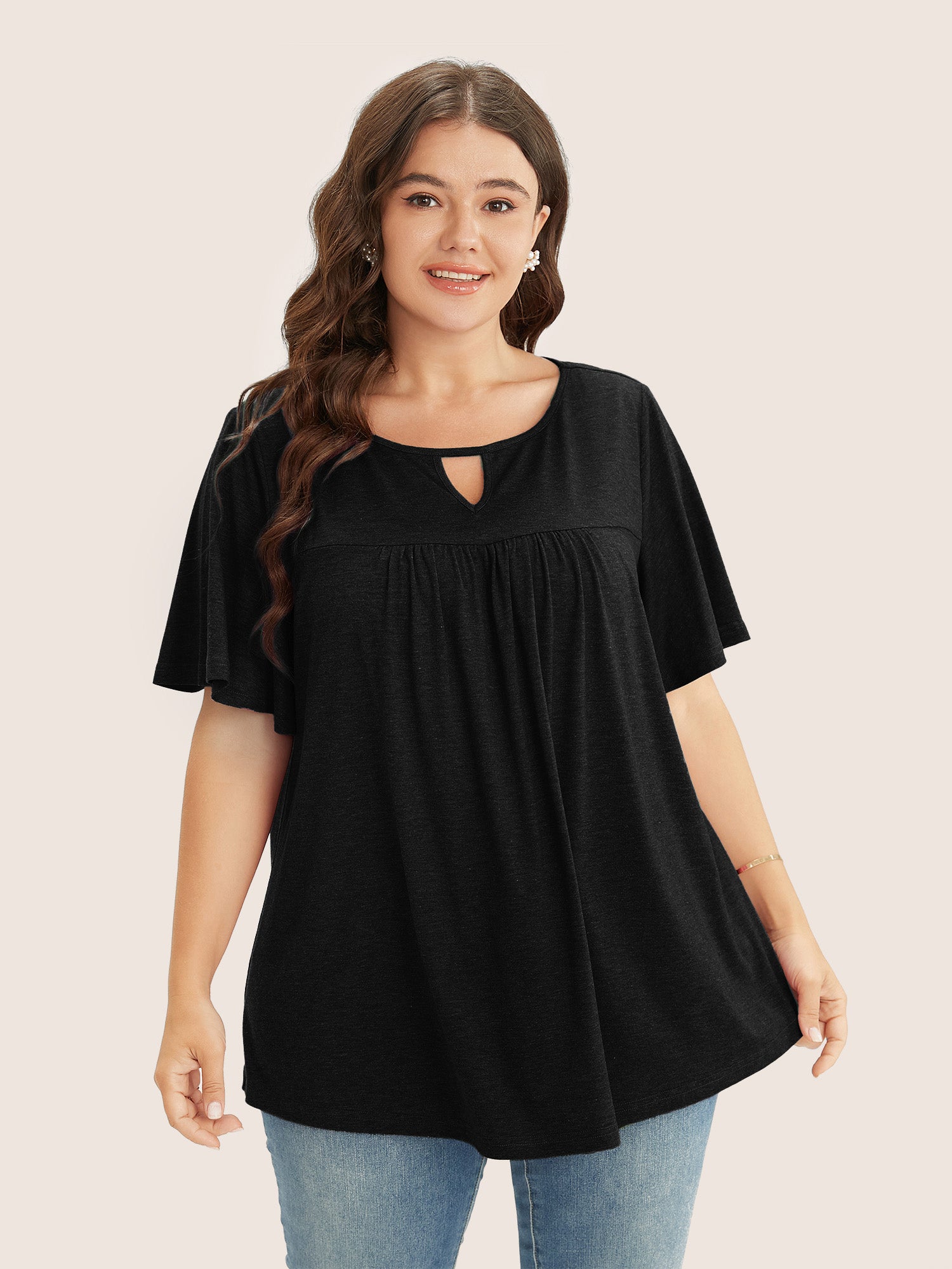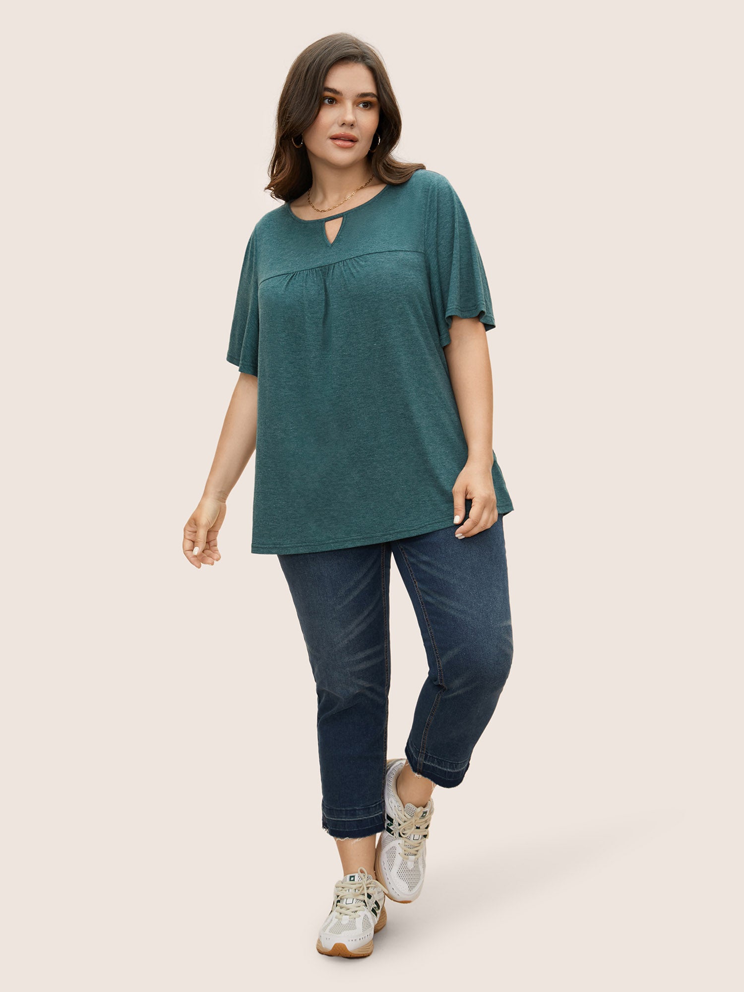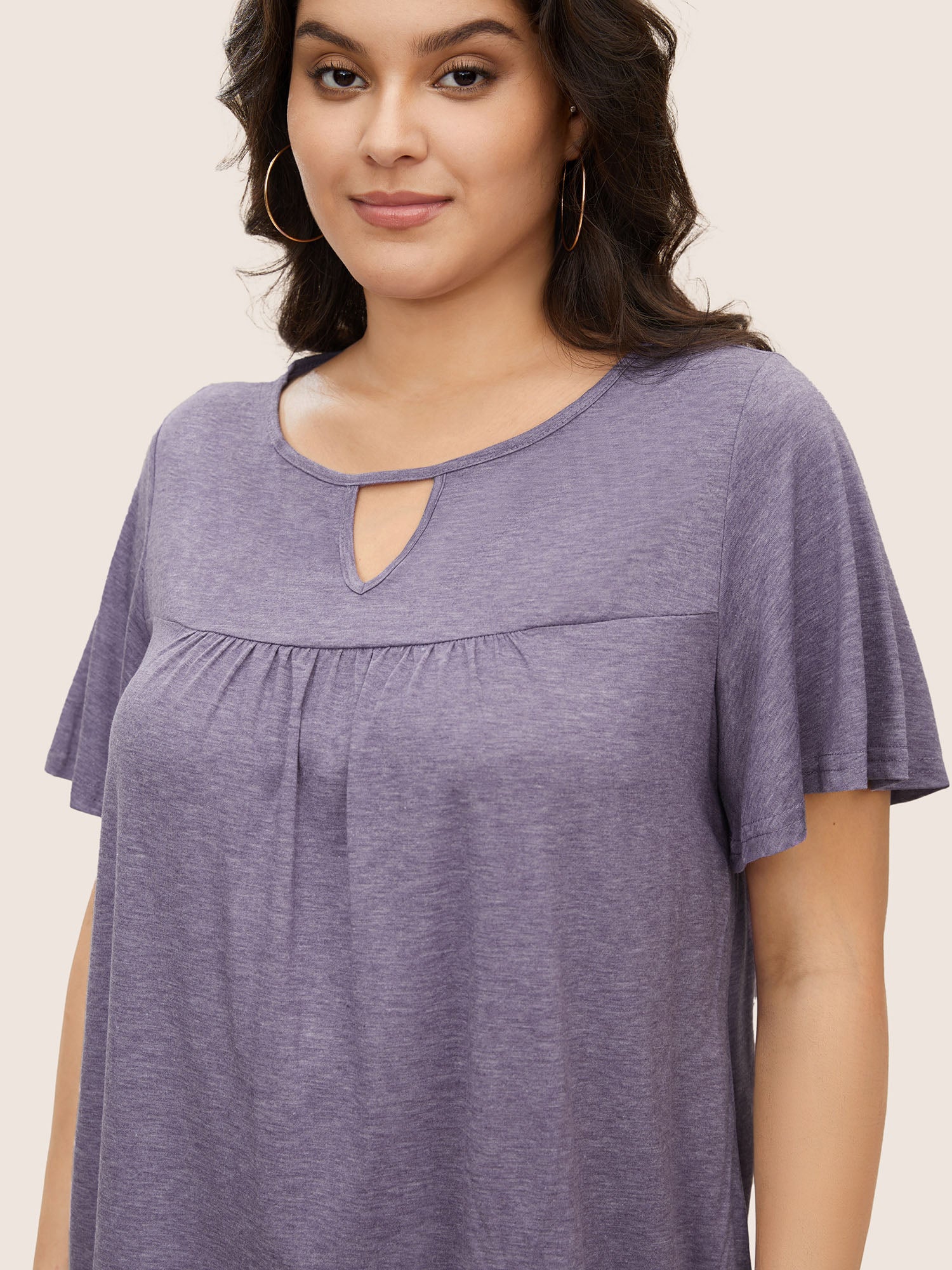 Plain Ruffle Sleeve Keyhole Gathered Crew Neck T-shirt