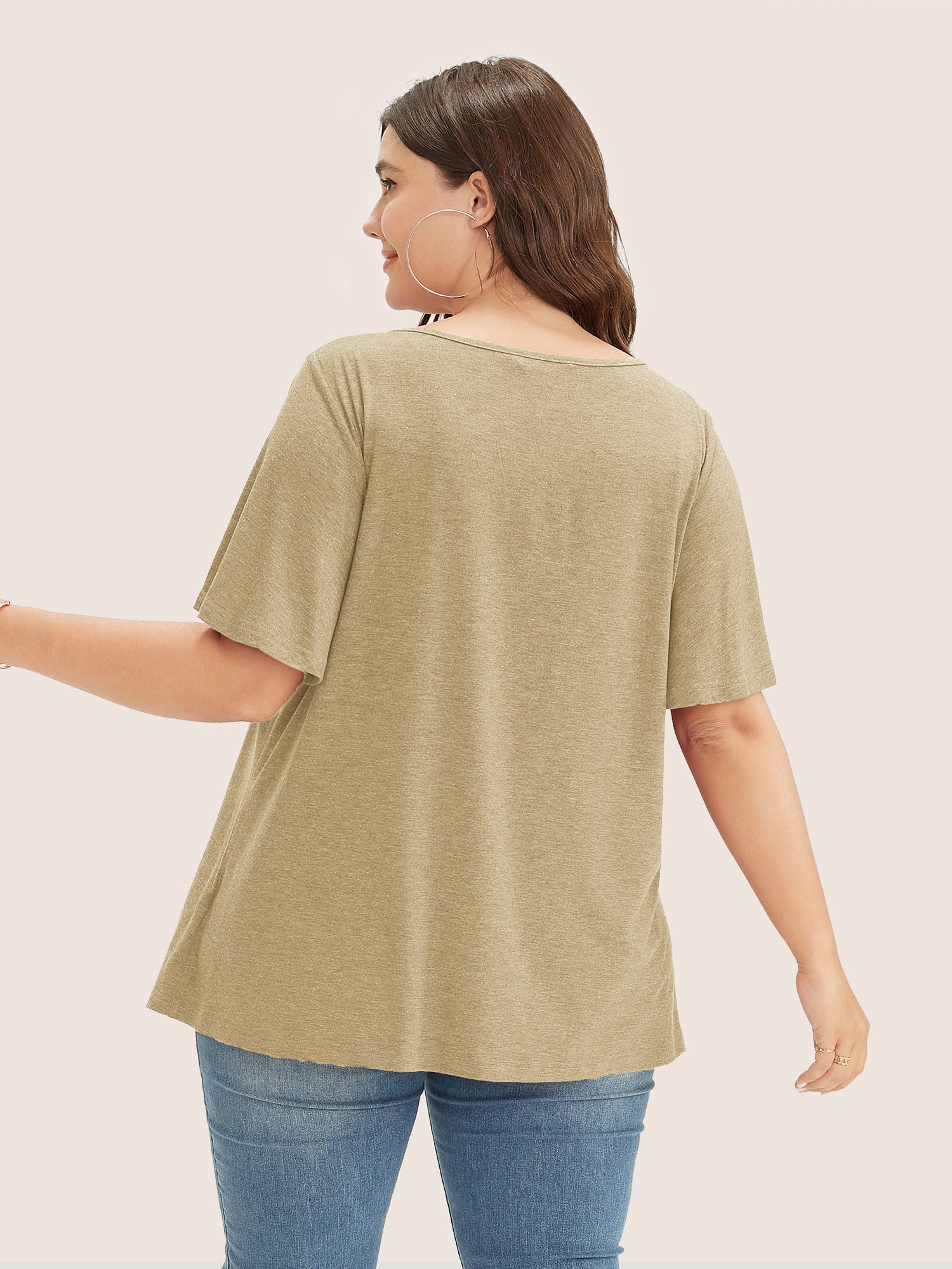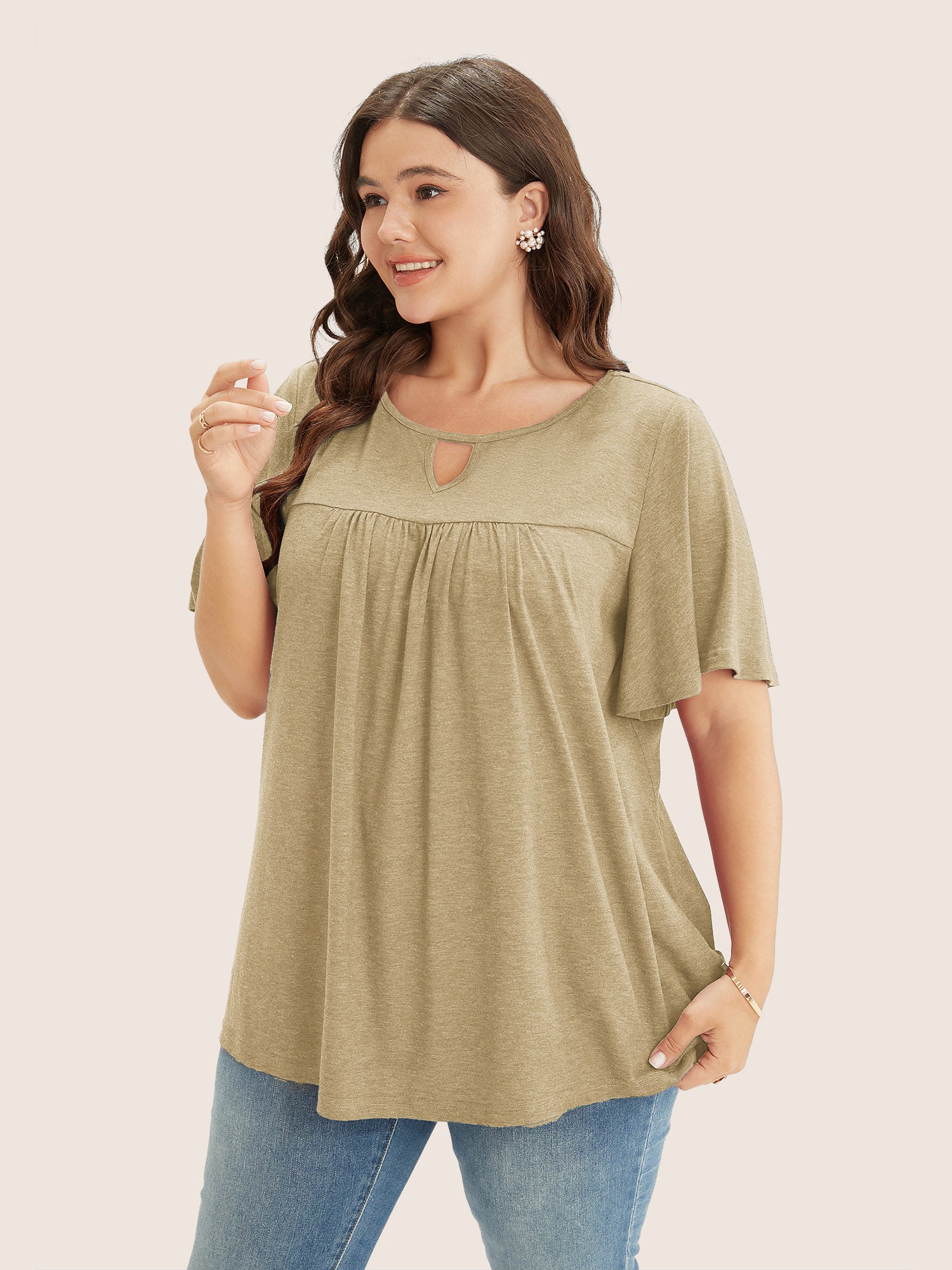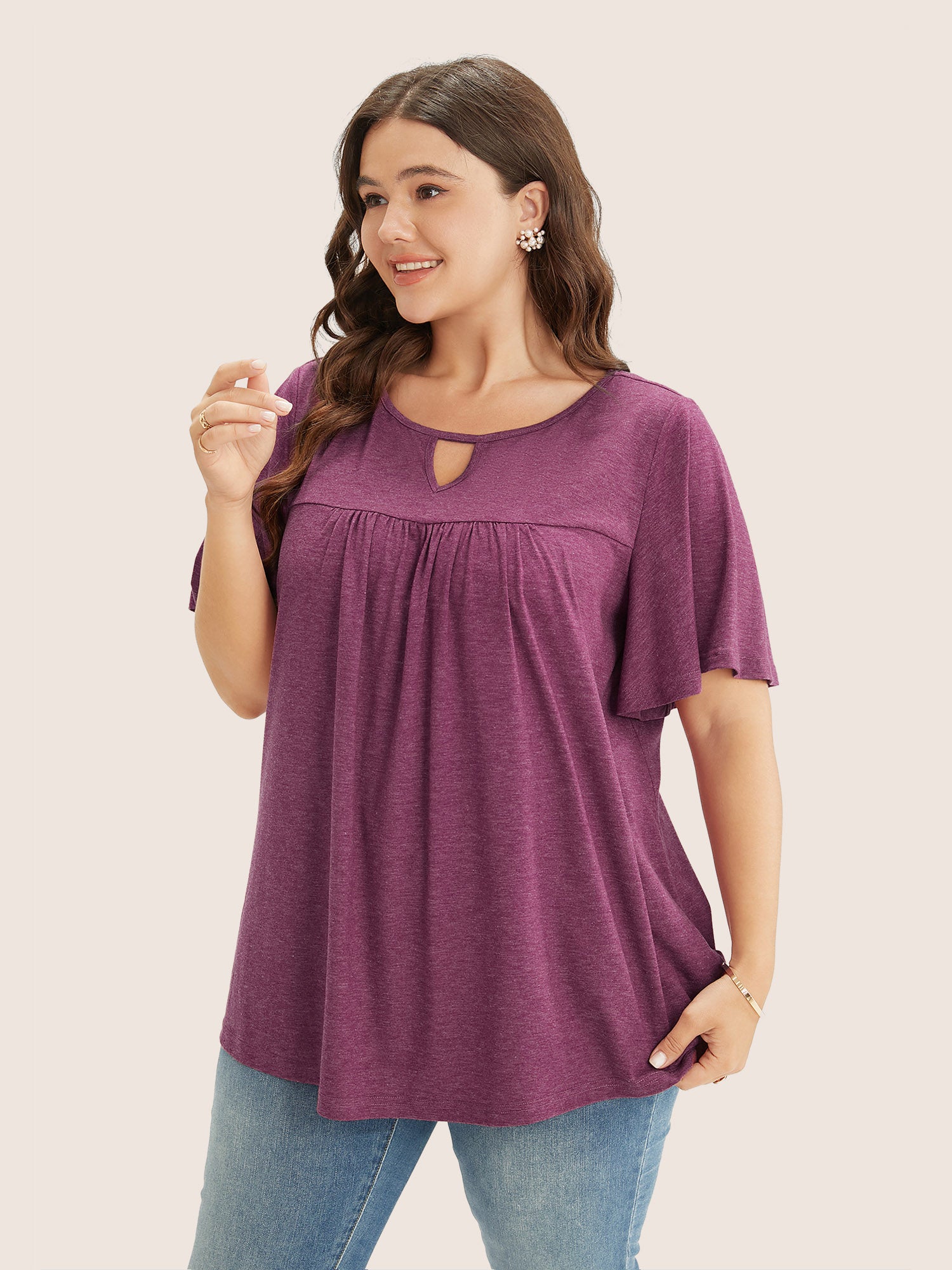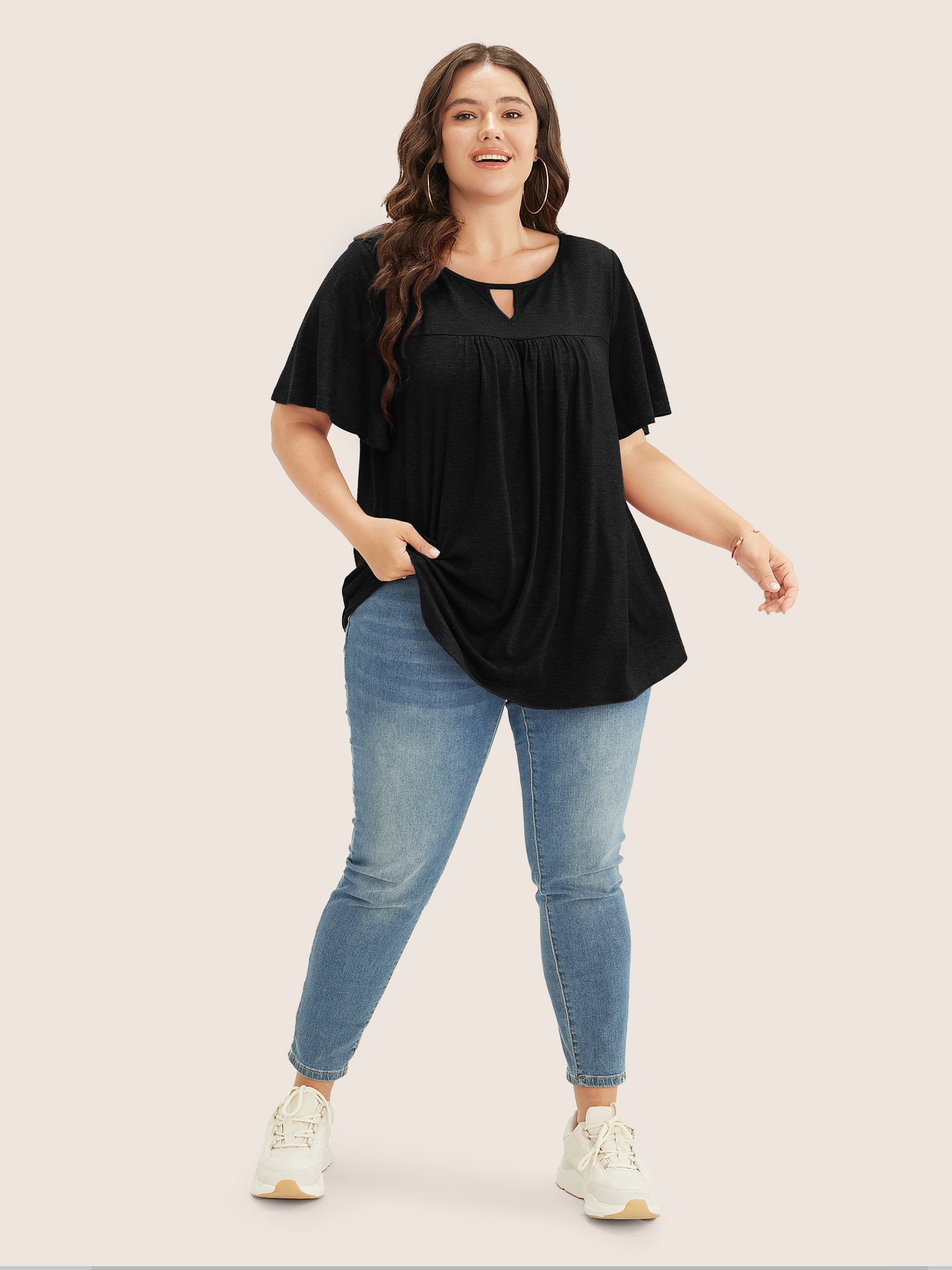 Plain Ruffle Sleeve Keyhole Gathered Crew Neck T-shirt