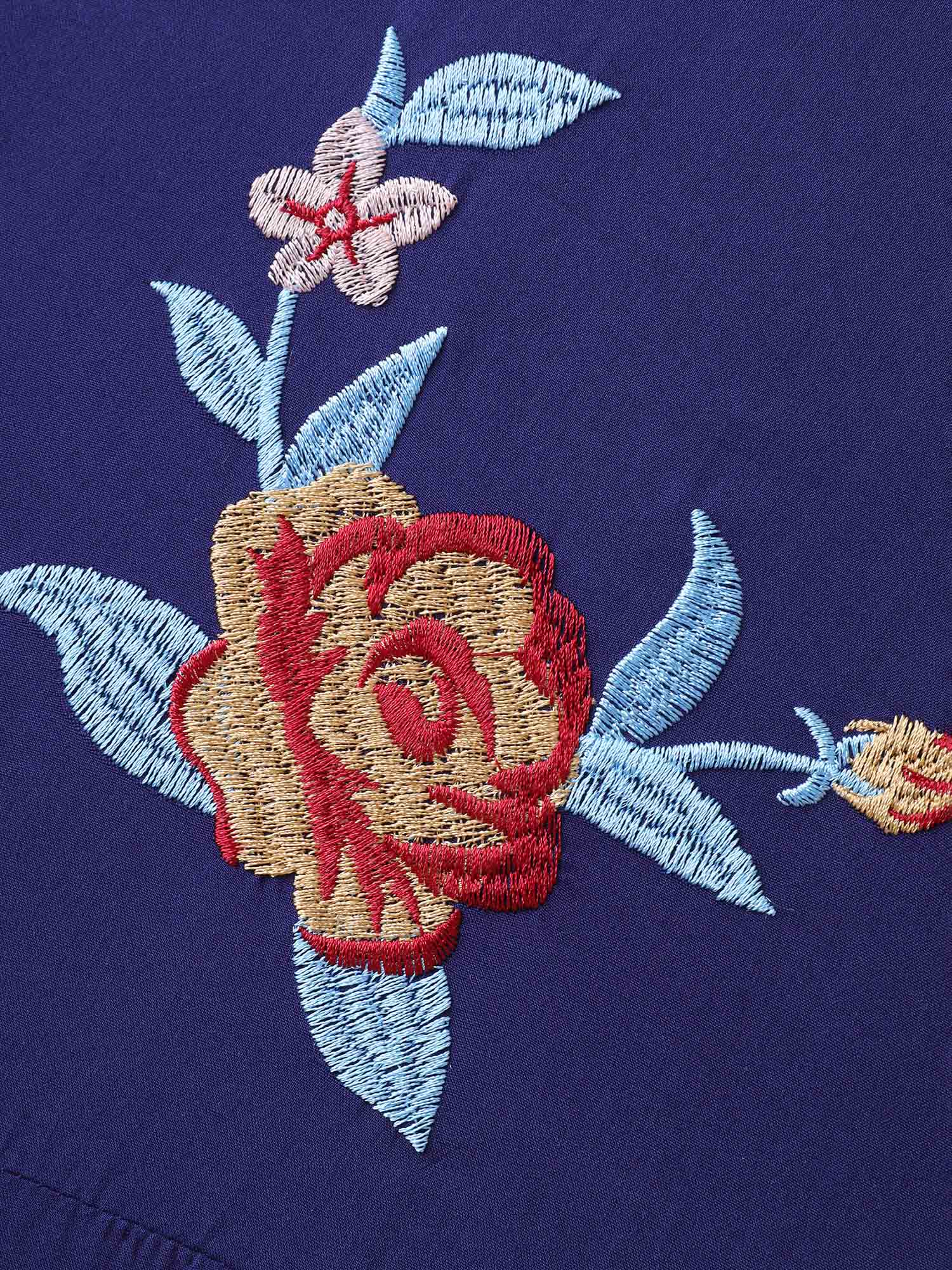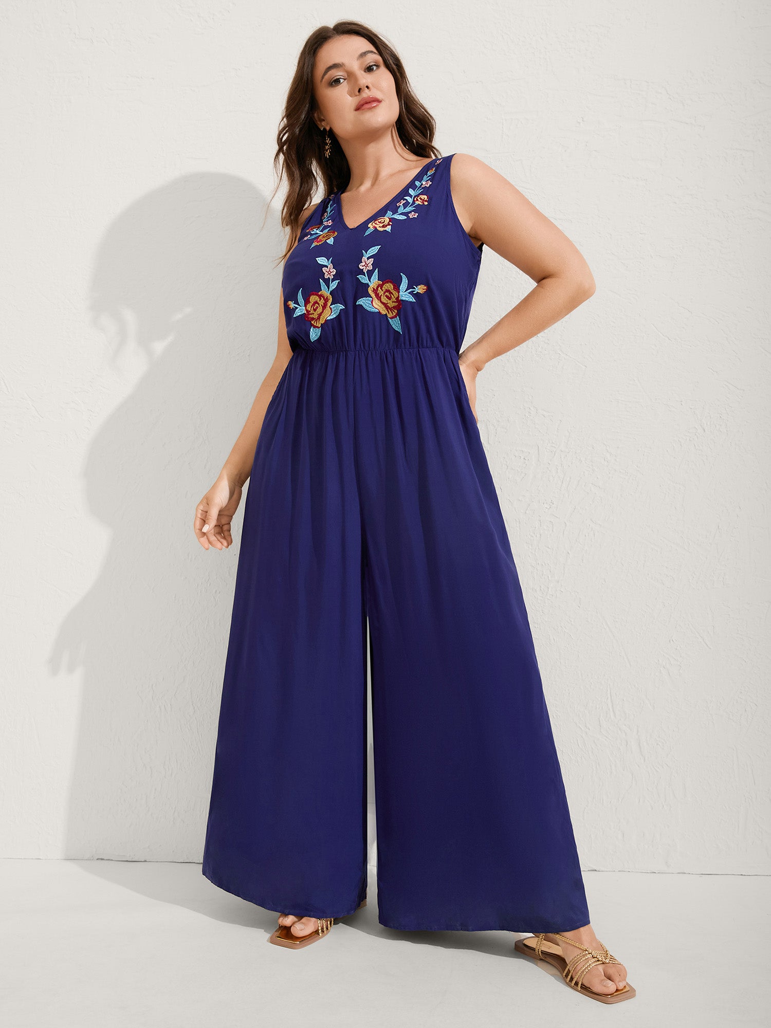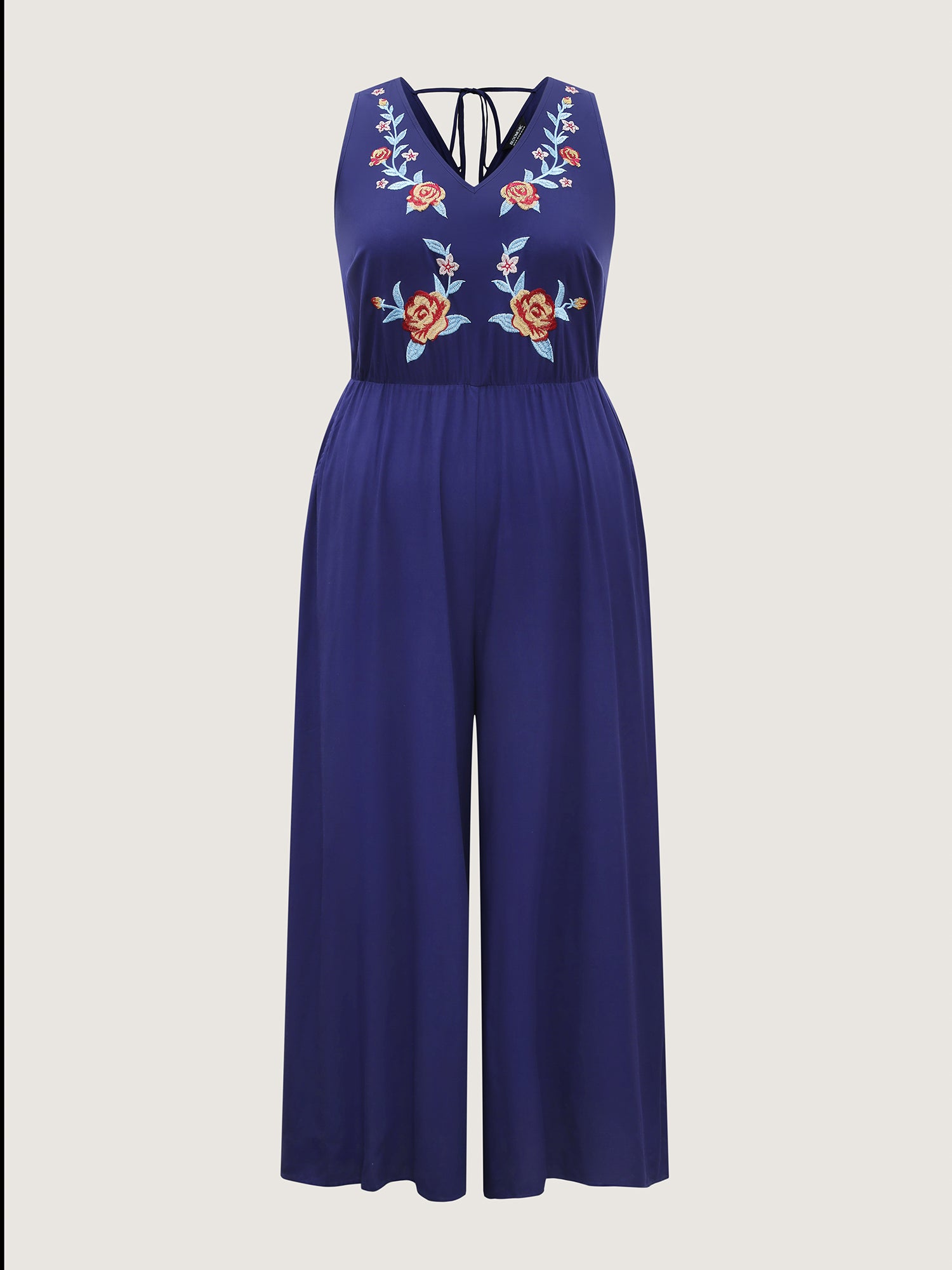 Rayon Floral Embroidery Stretchy Waist Jumpsuit