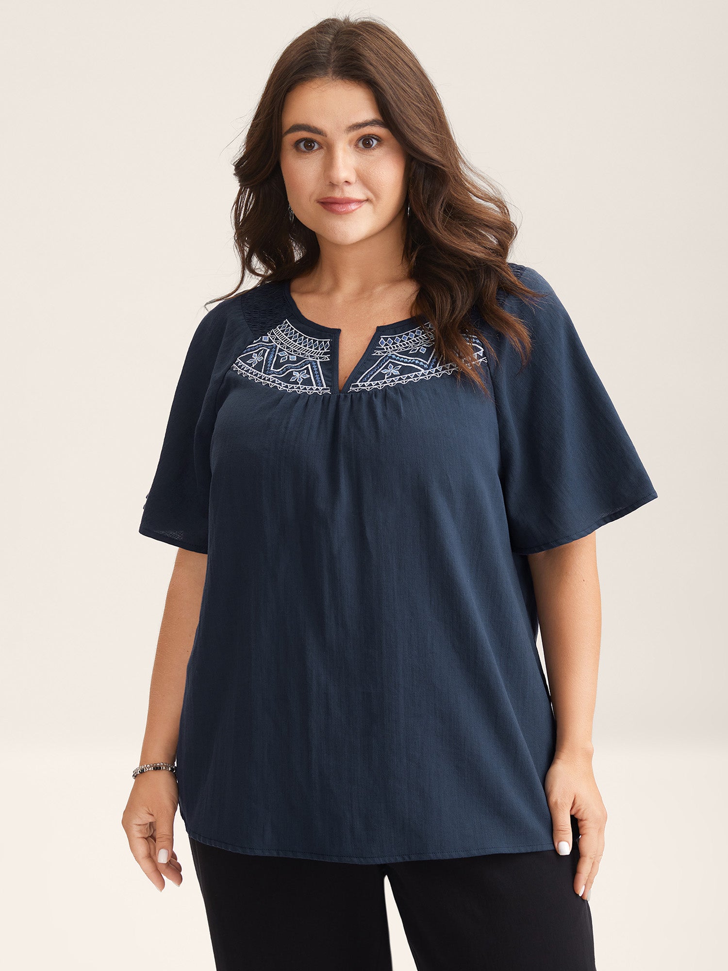 Cotton Boho Embroidered Neck Shirred Shoulder Blouse