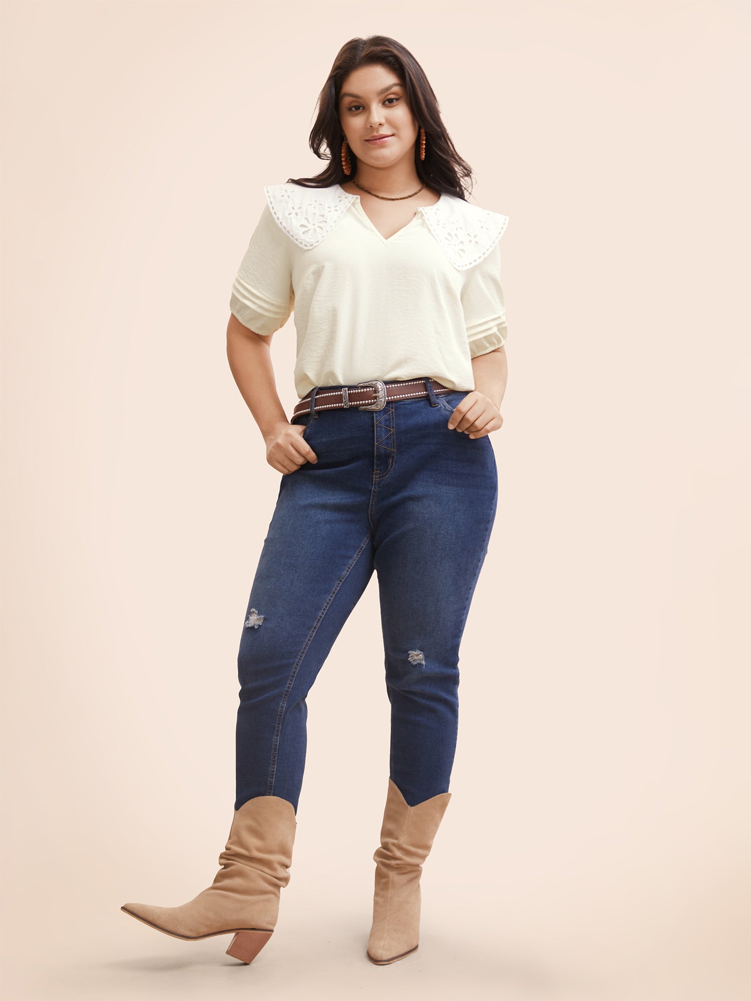 Cotton Floral Embroidered Notched Collar Frill Trim Blouse