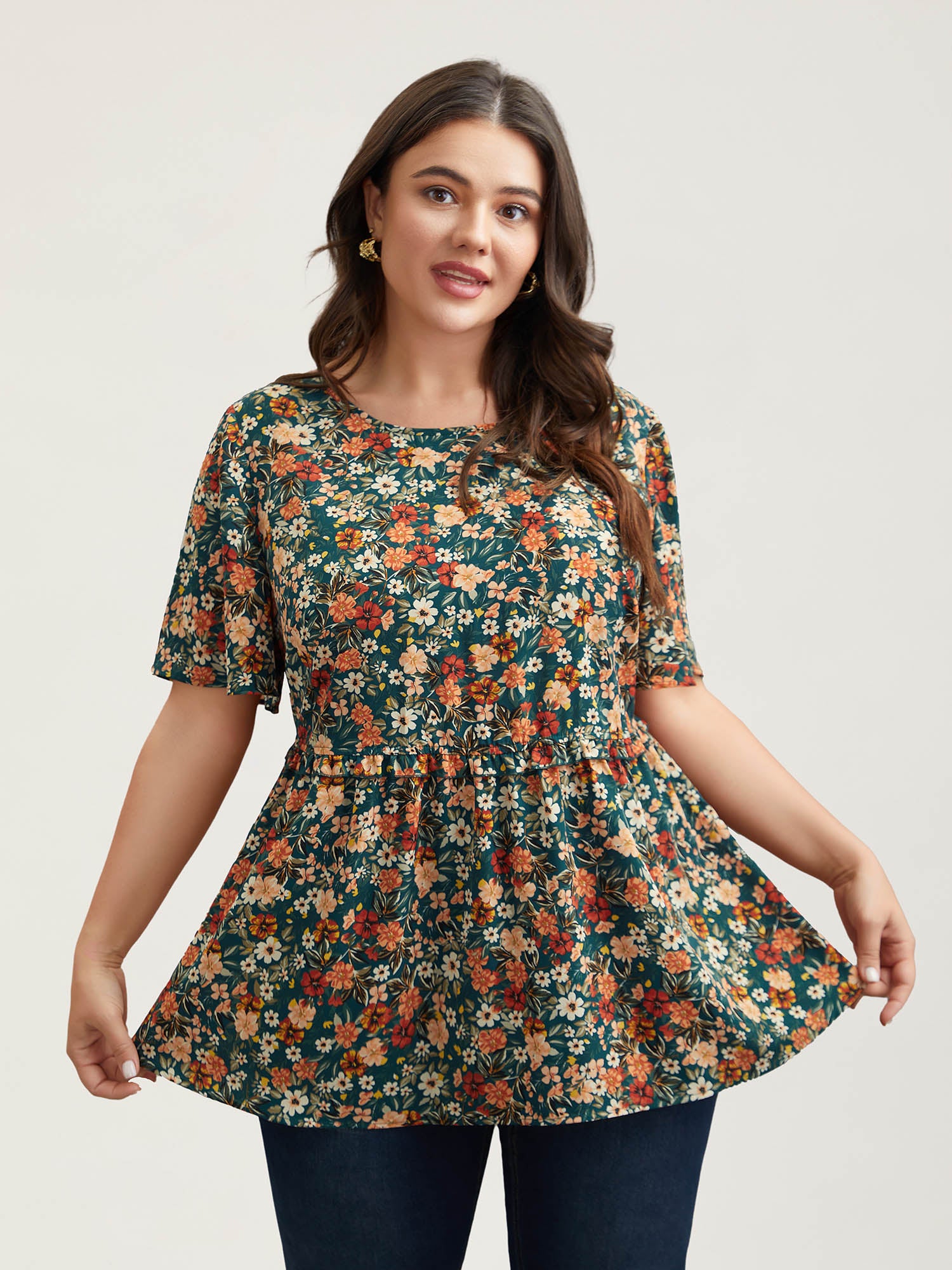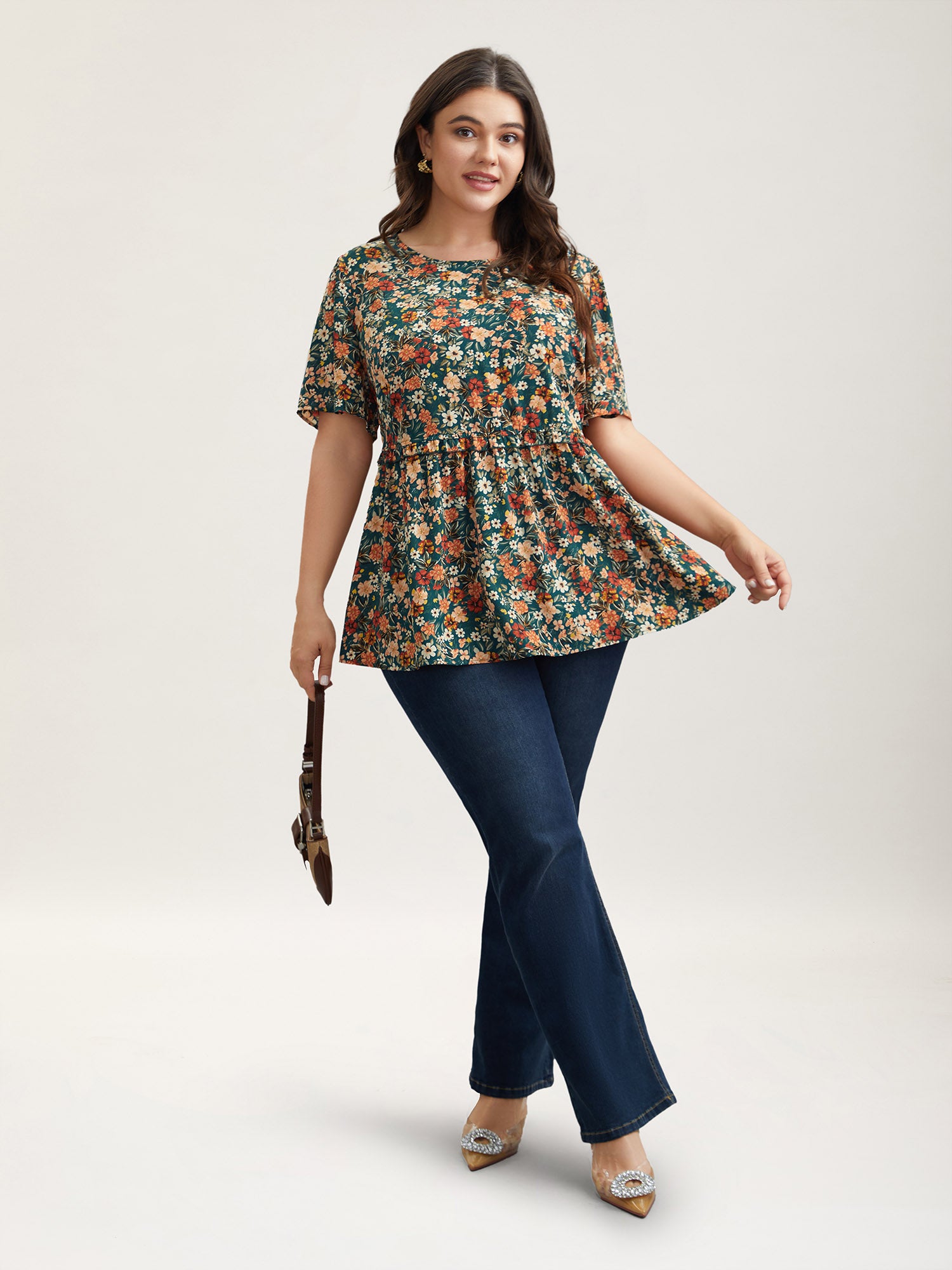 Spring Pattern Neck Cut-Out Pleated Shirt