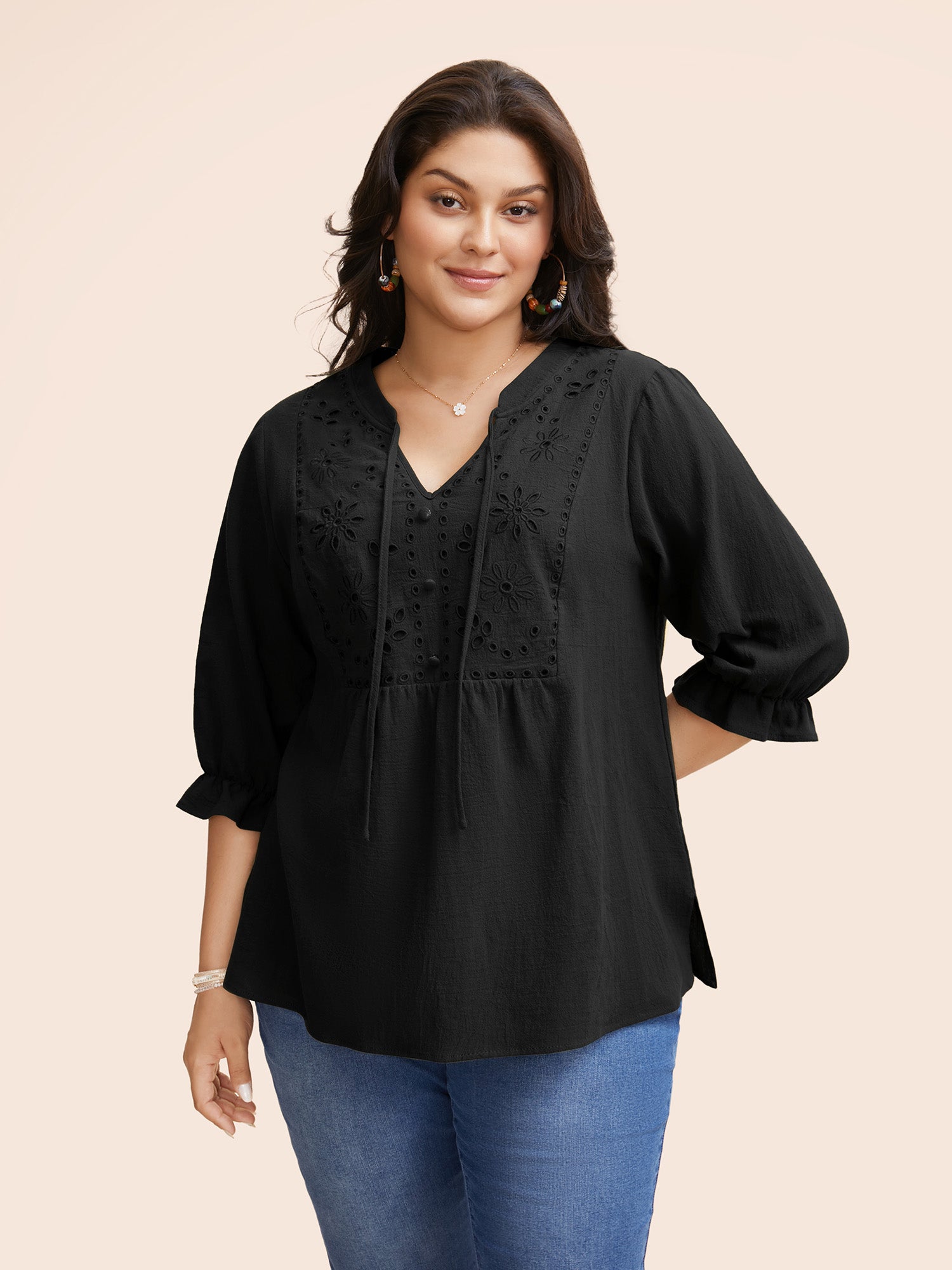 • Broderie Anglaise Tie Knot Lantern Sleeve Blouse