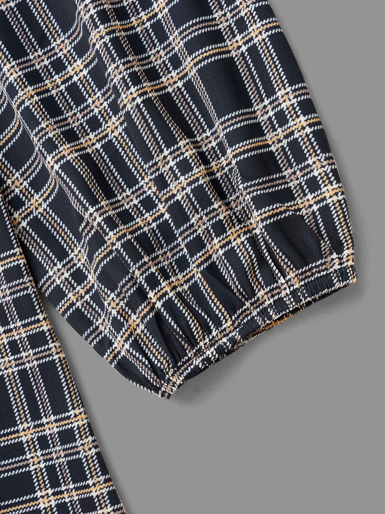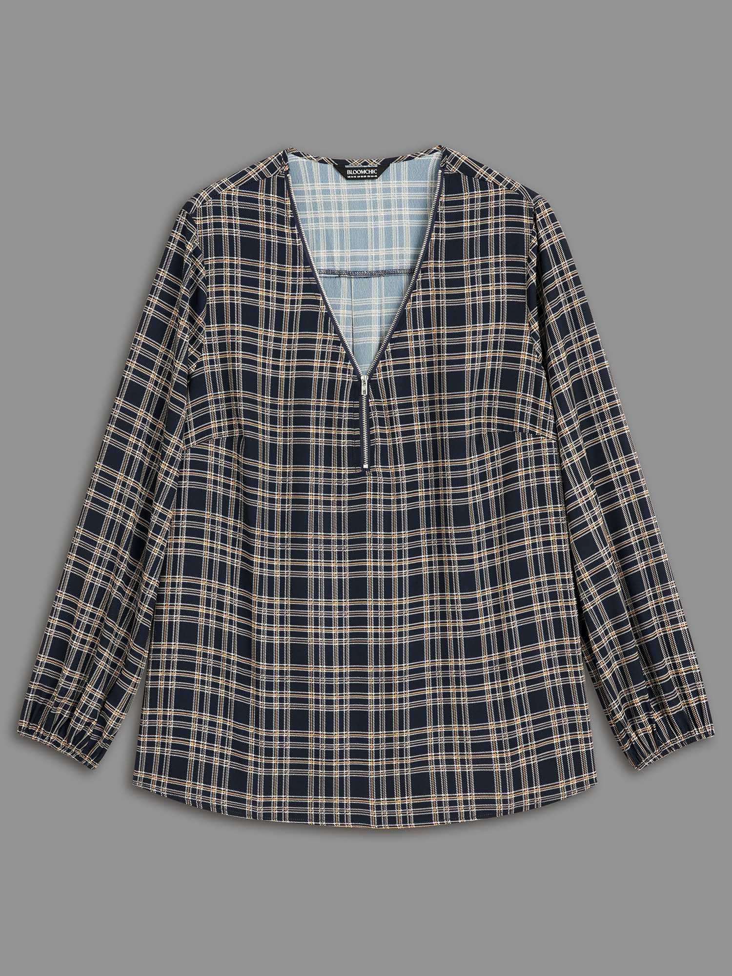 Plaid Zipper Front Lantern Sleeve Blouse