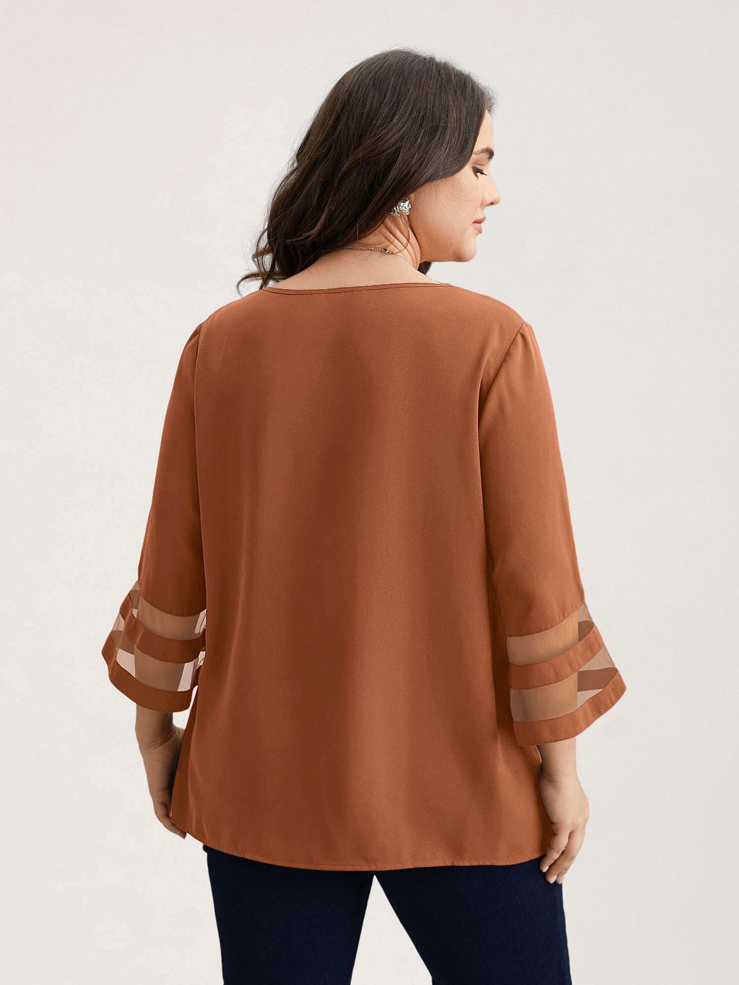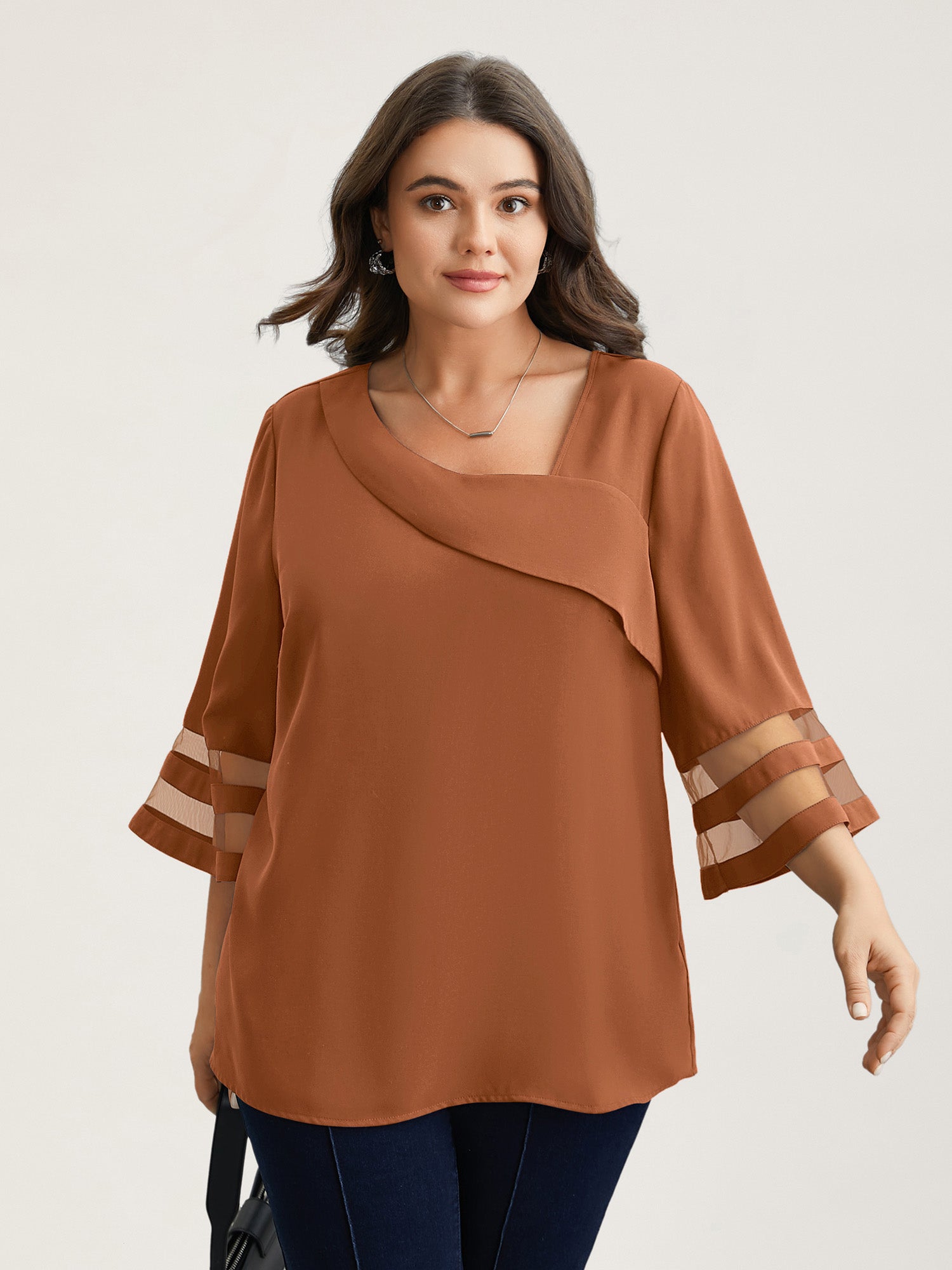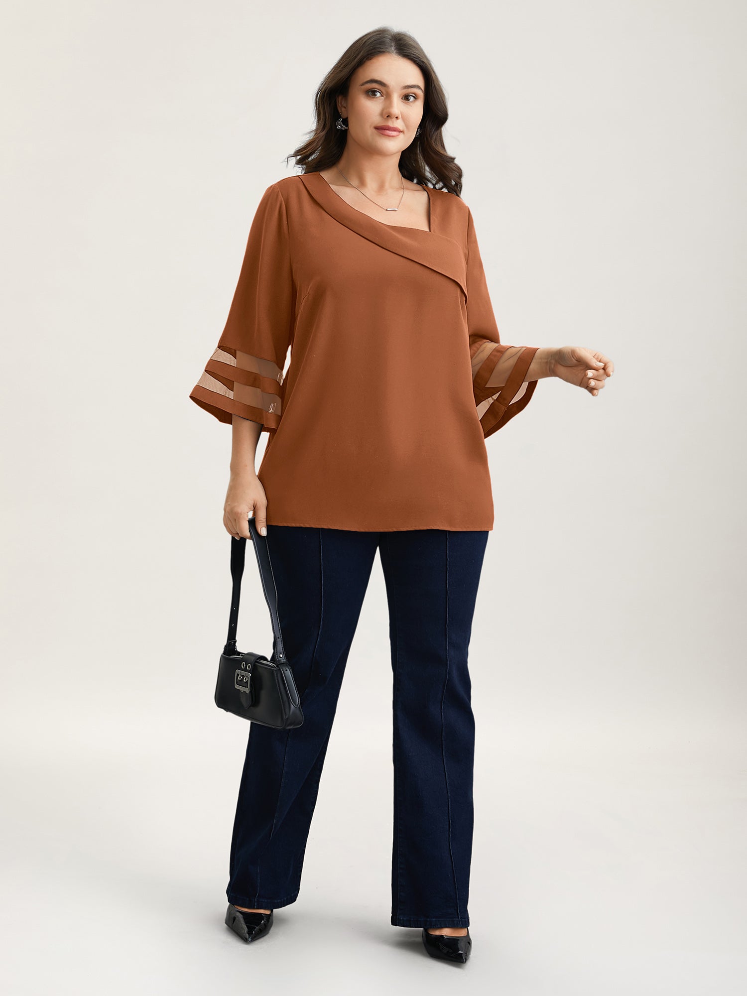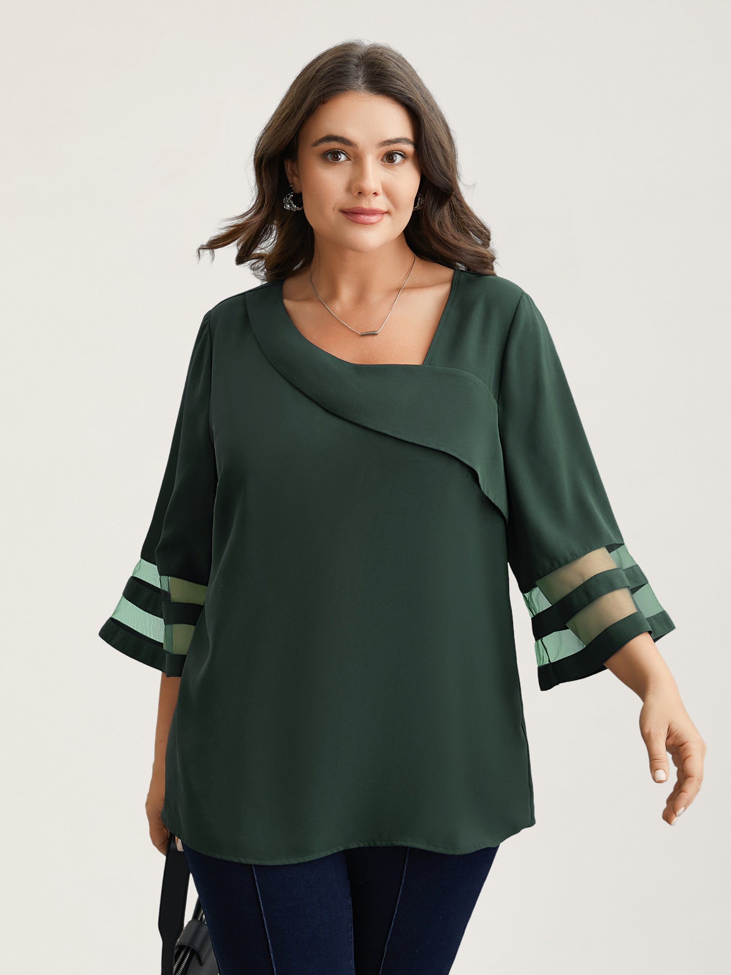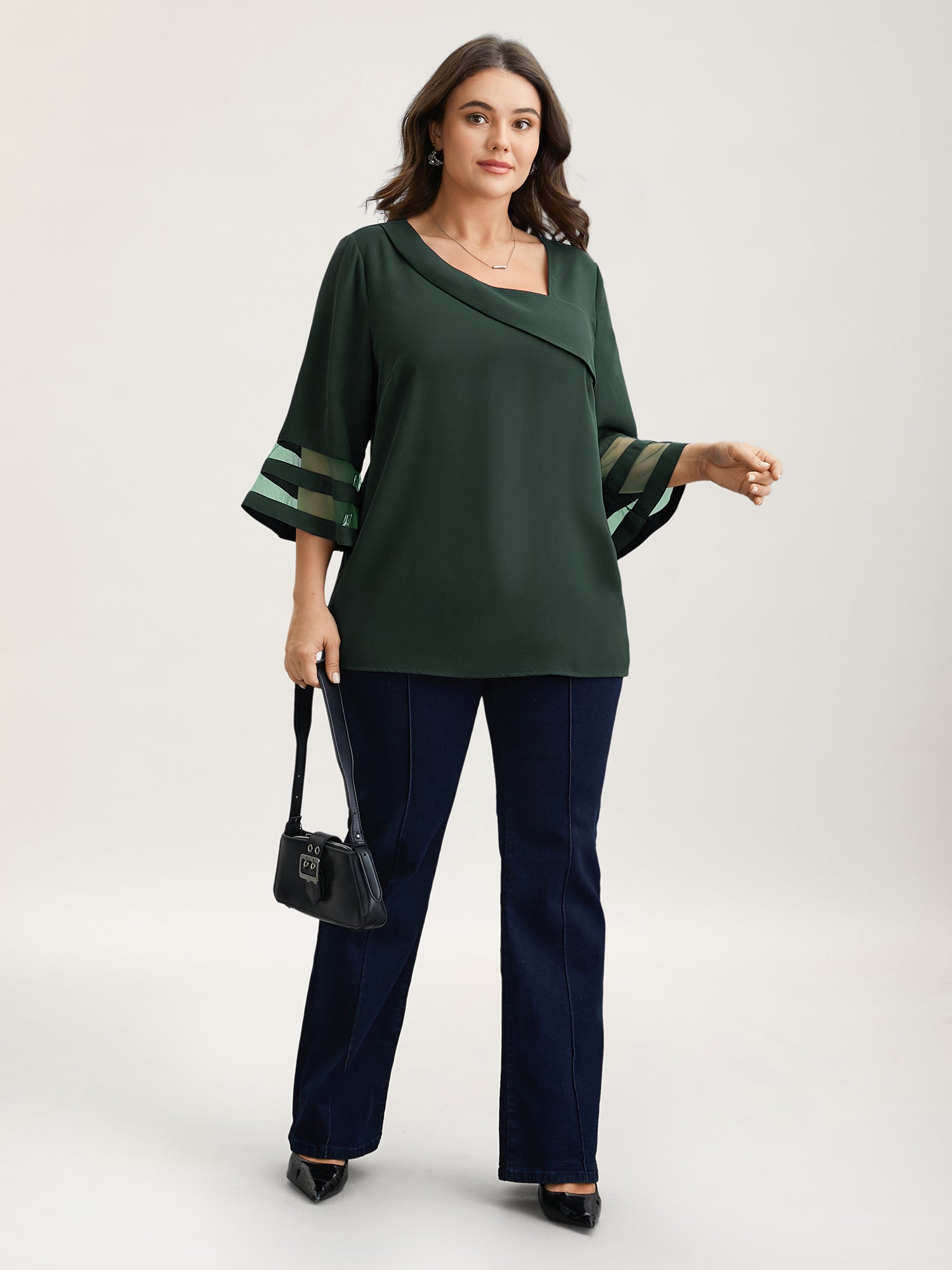 • Sheer Sleeve Patchwork Asymmetrical Neckline Blouse