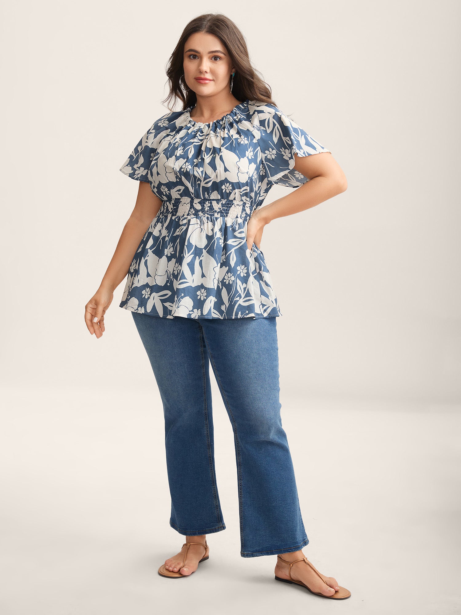 • Cotton Silhouette Floral Print Shirred Waist Blouse