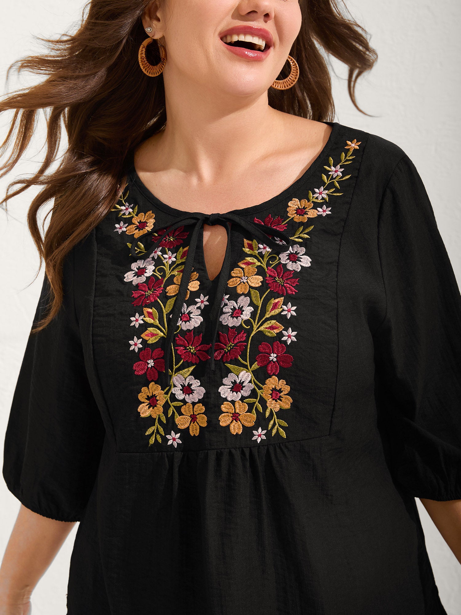 Floral Embroidered Tie Knot Lantern Sleeve Blouse