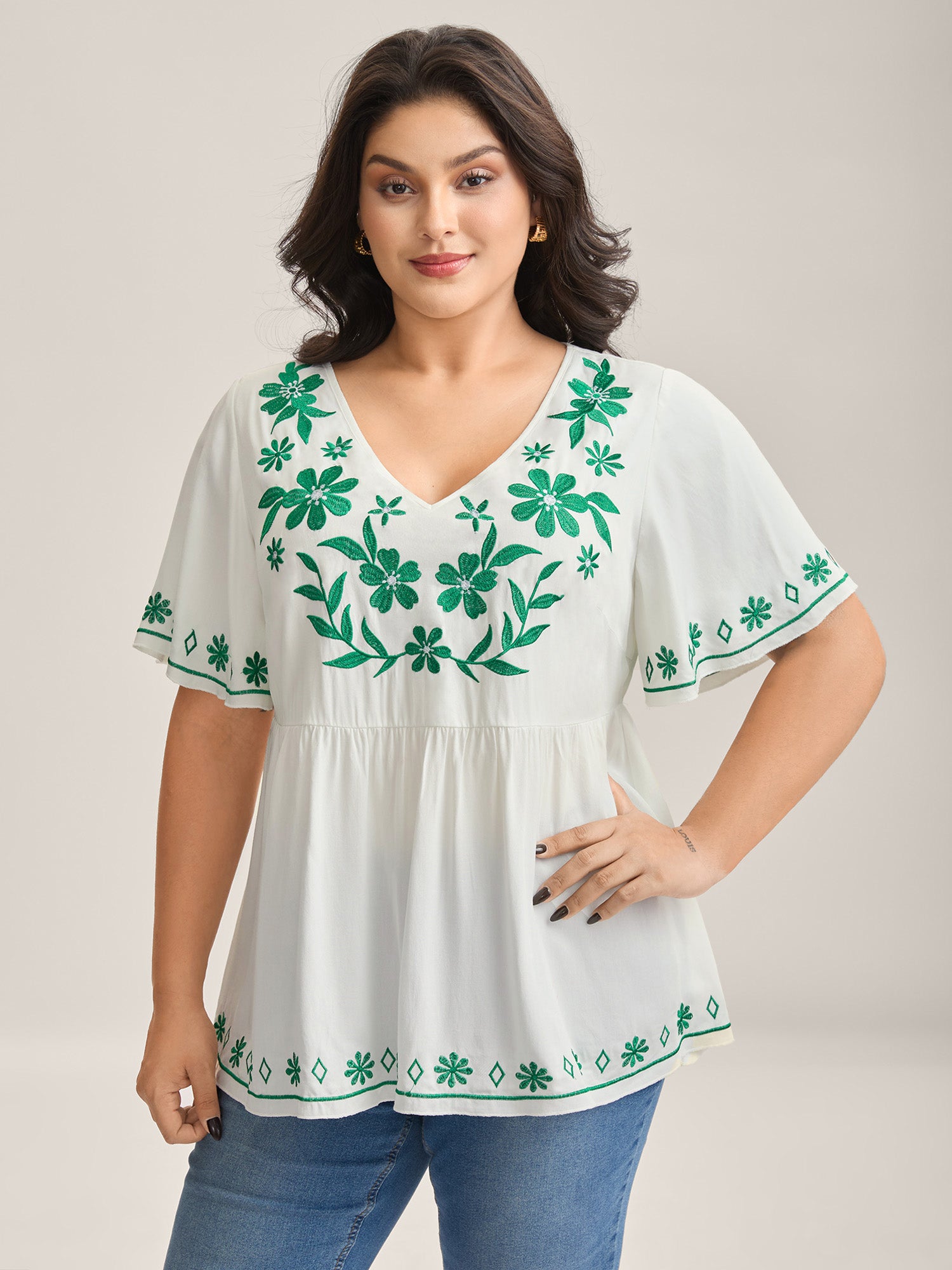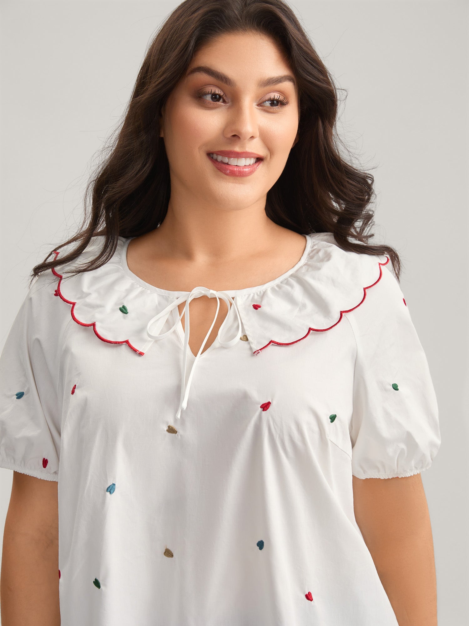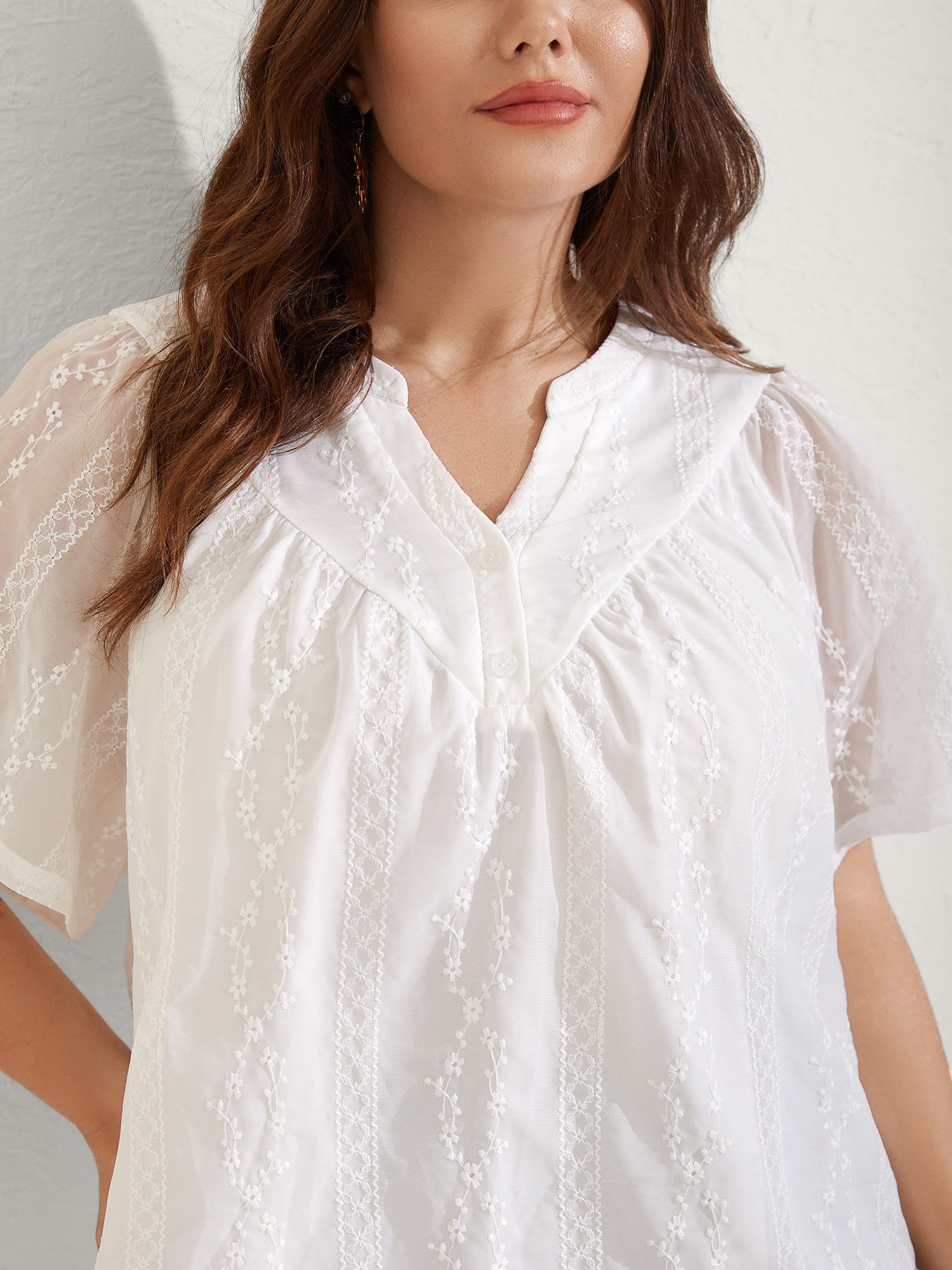 Floral Embroidered Mesh Bubble Sleeve Blouse