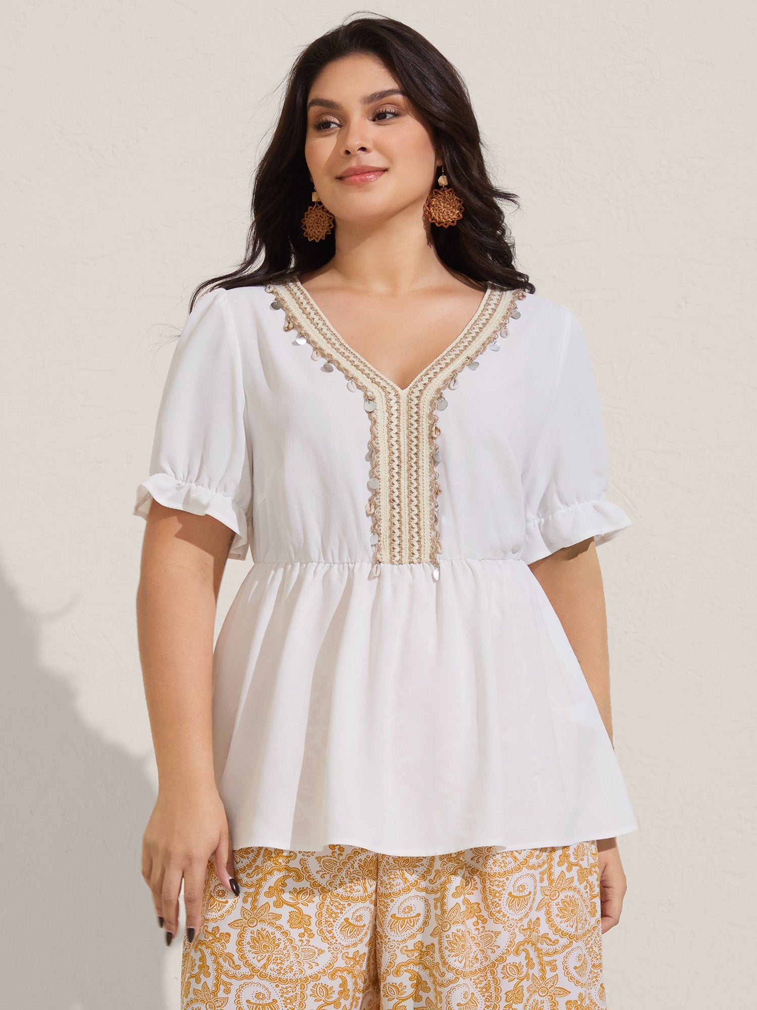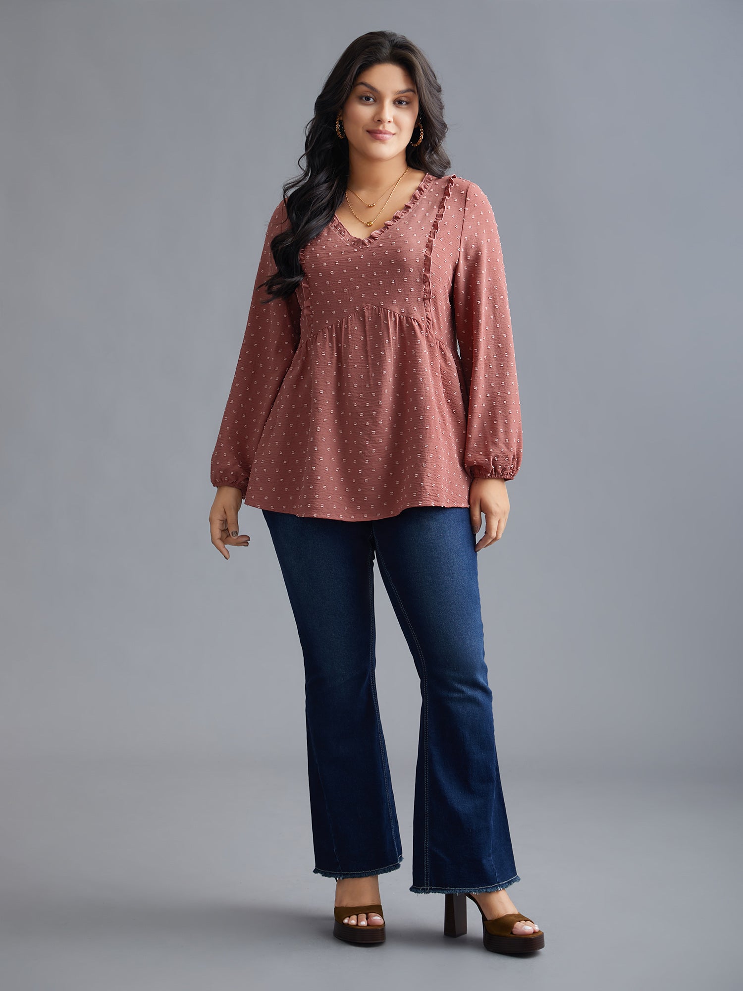 V Neck Ruffle Trim Elastic Cuffs Blouse