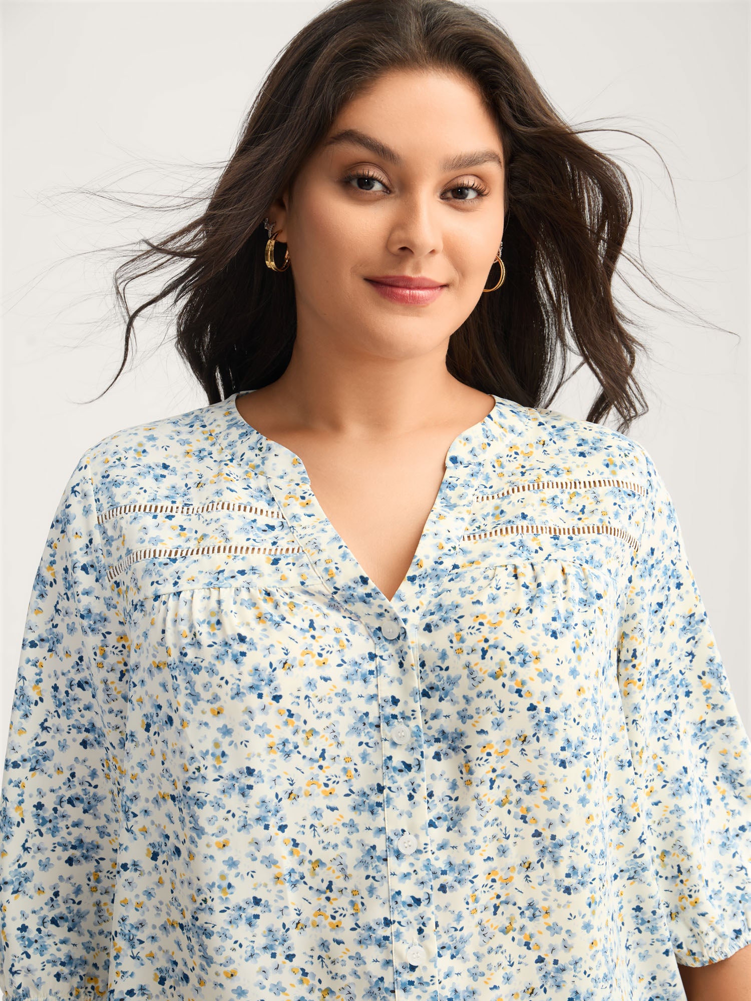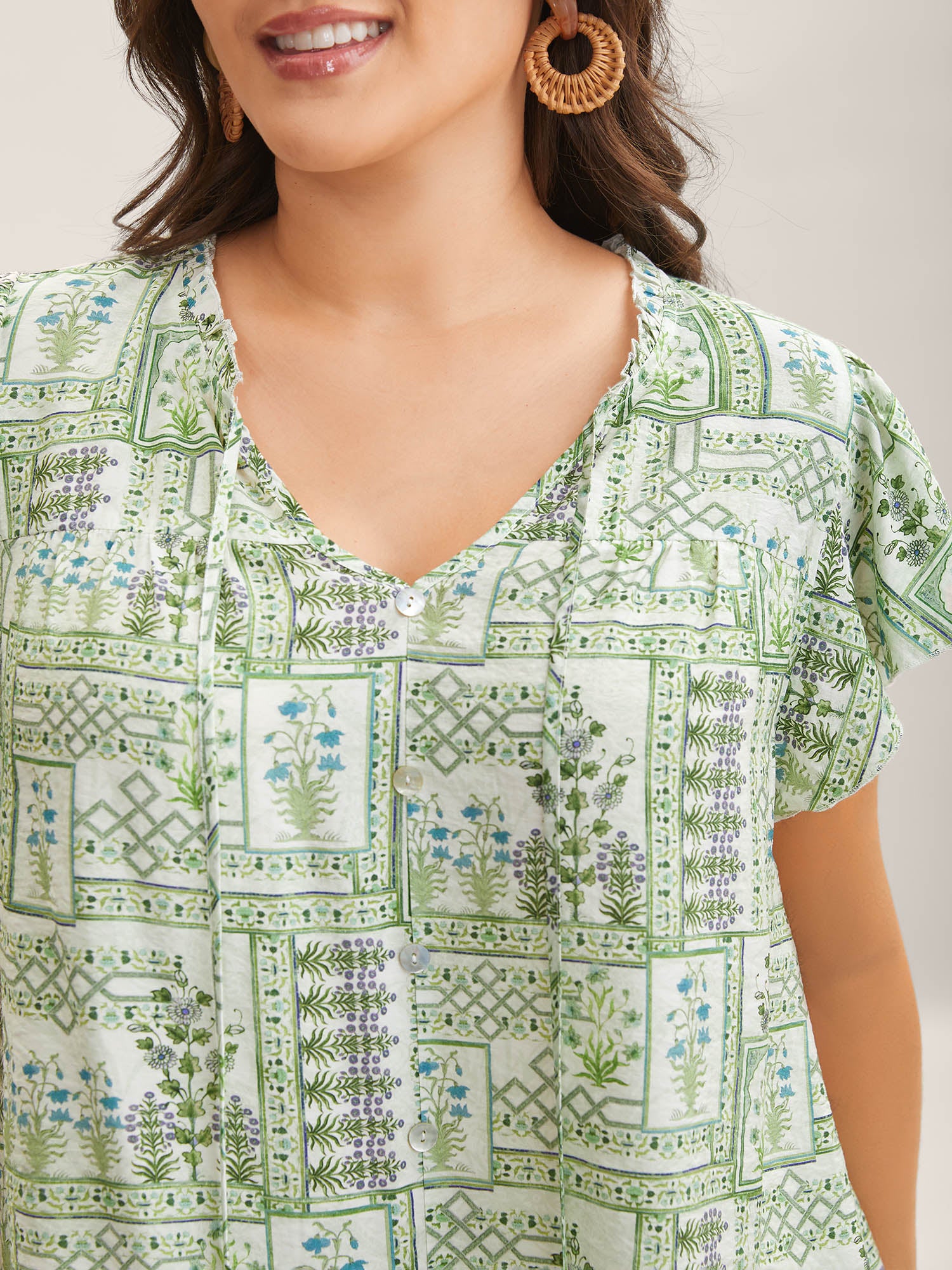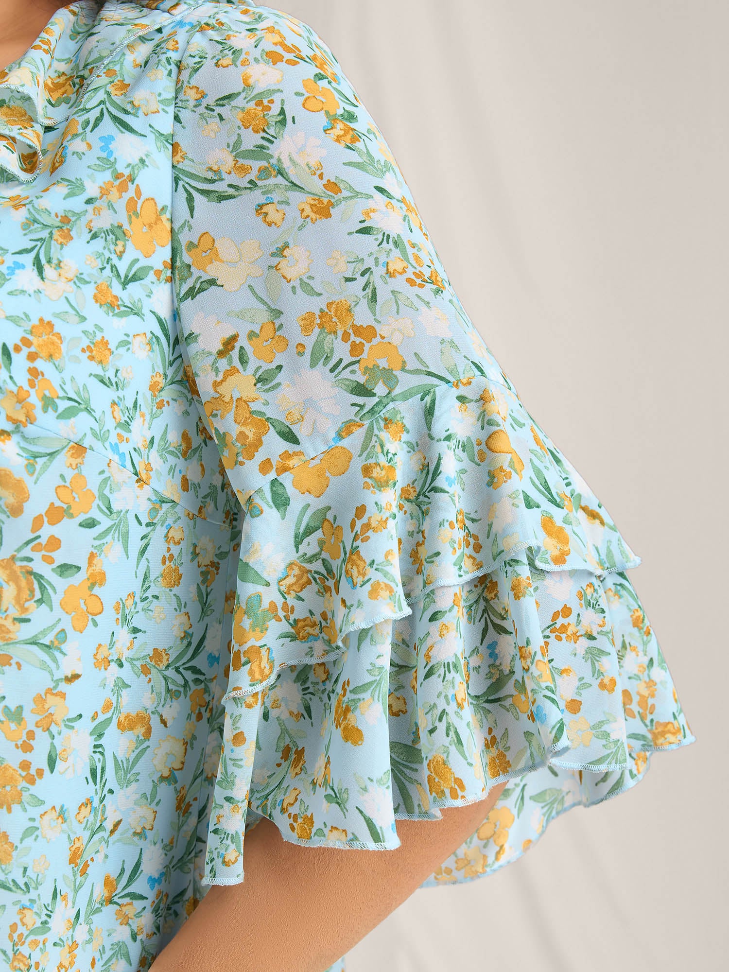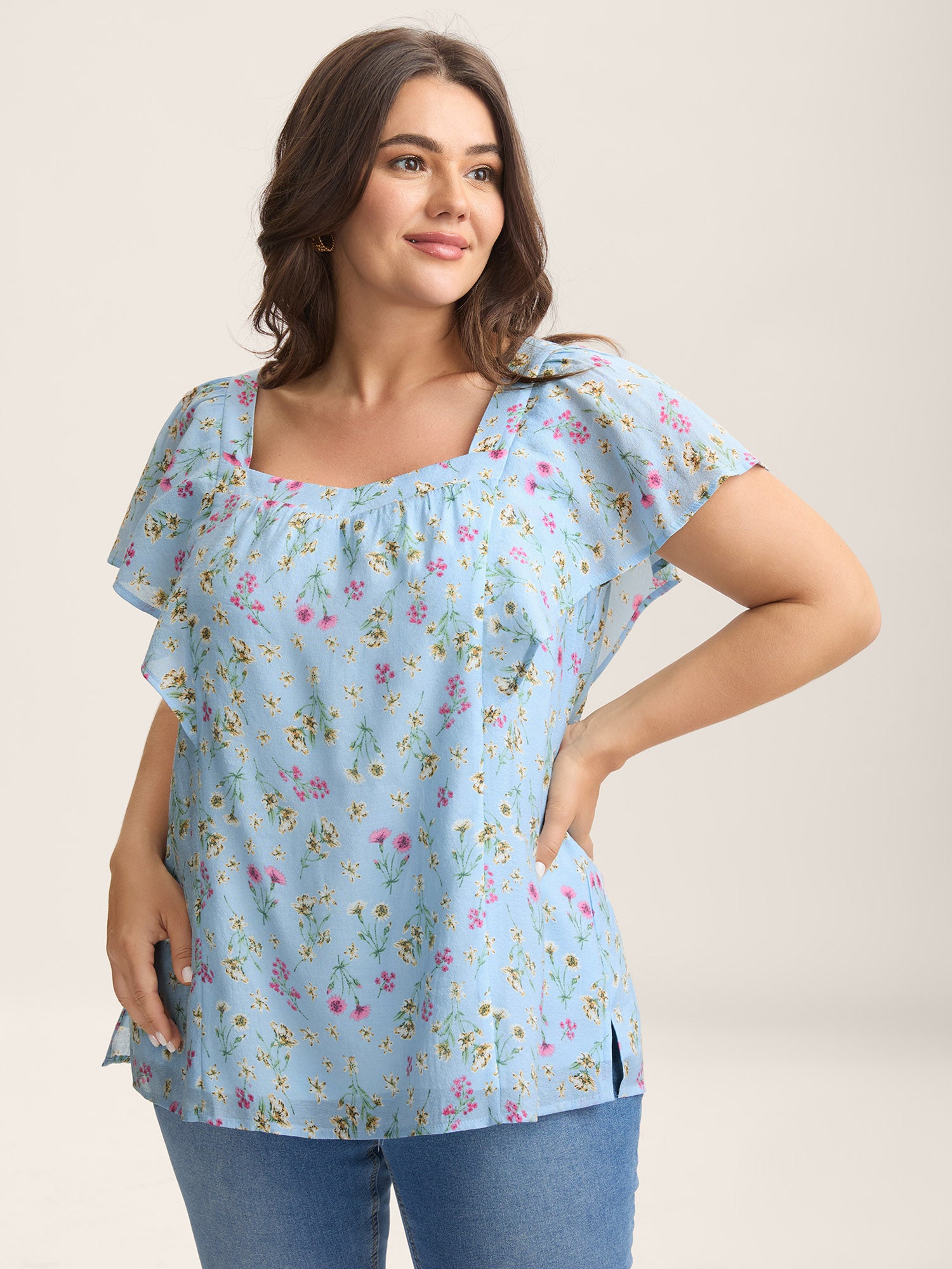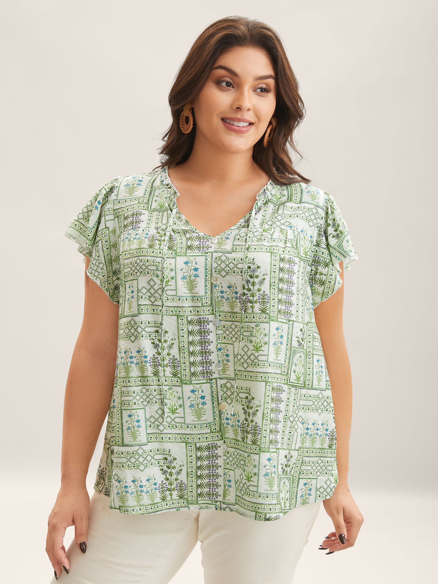 Floral Lotus Leaf Sleeve Split Neck Blouse