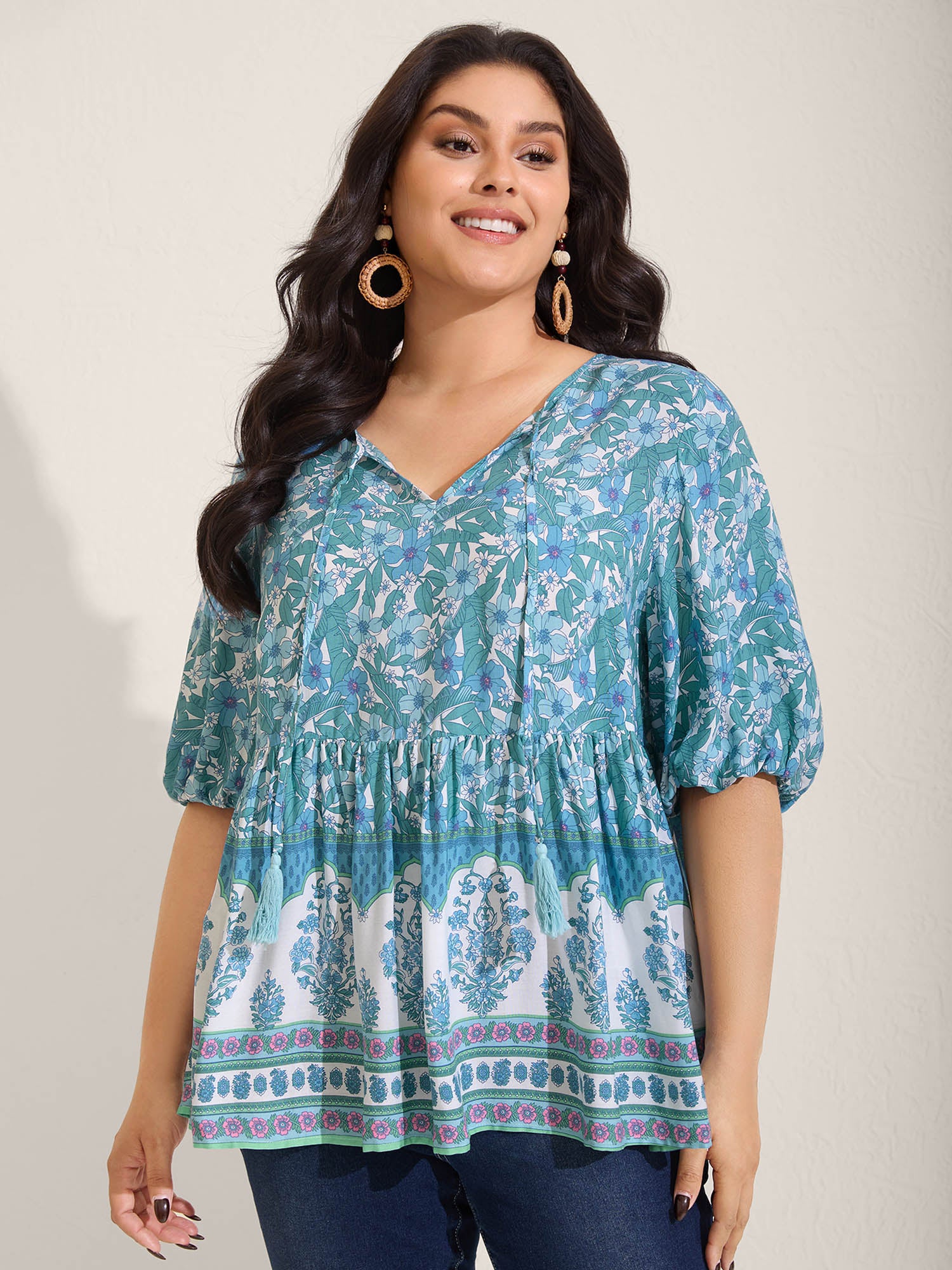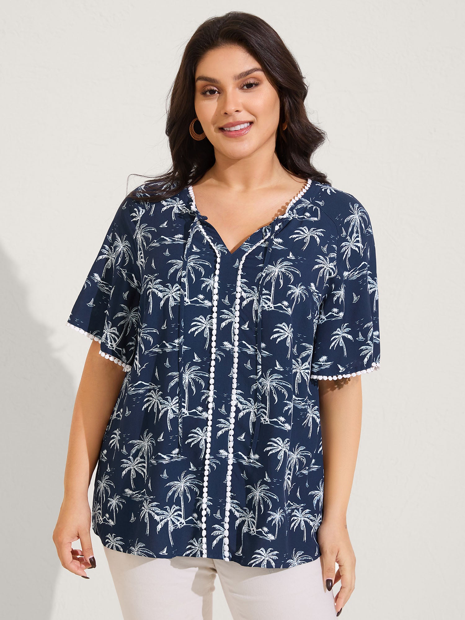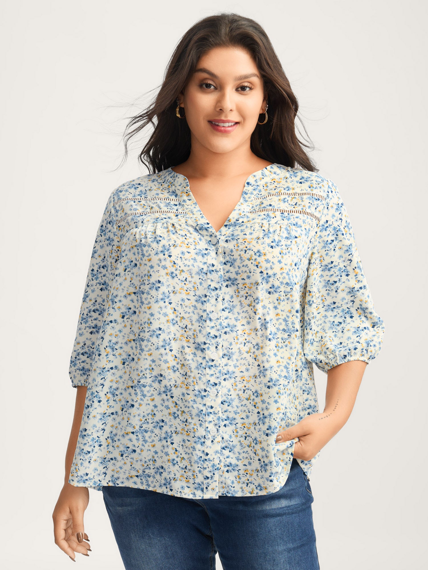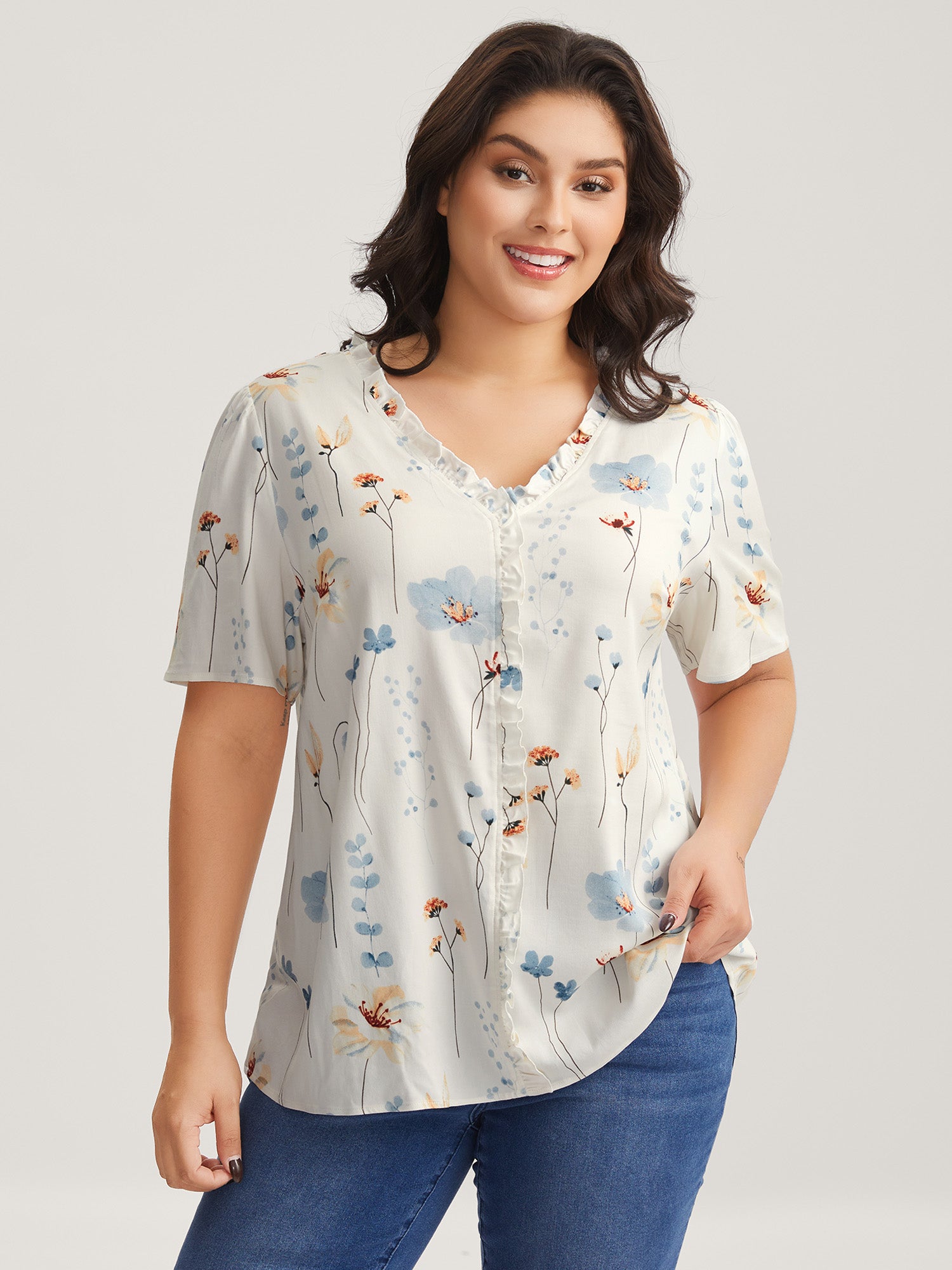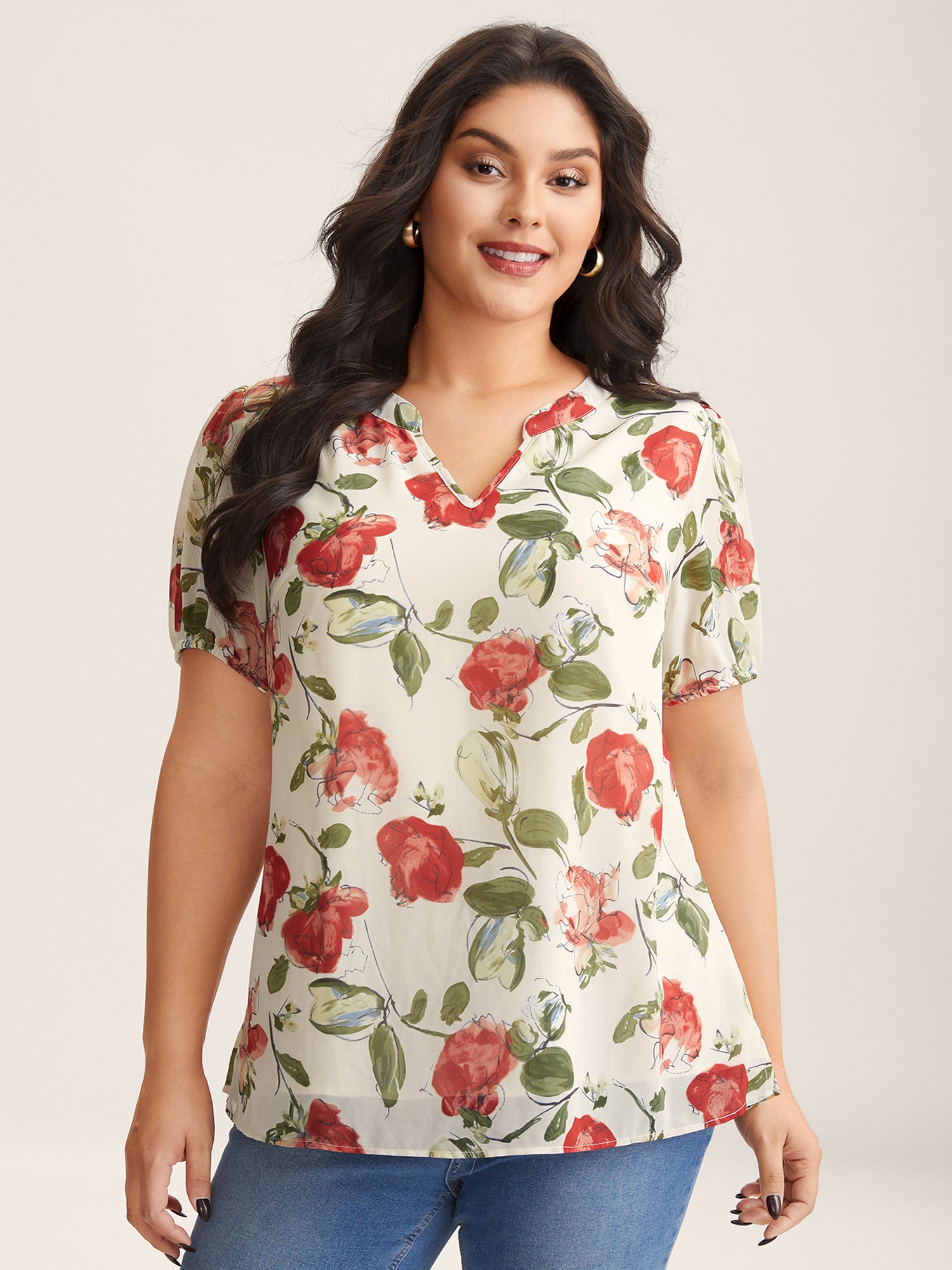 Floral Lotus Leaf Sleeve Split Neck Blouse