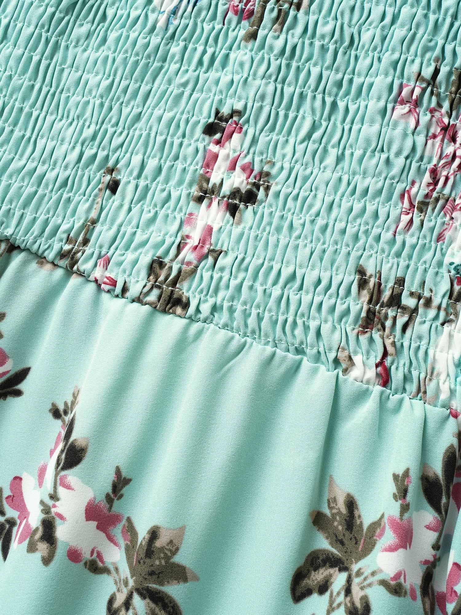 • Floral Square Neck Ruffles Pocket Shirred Split Dress