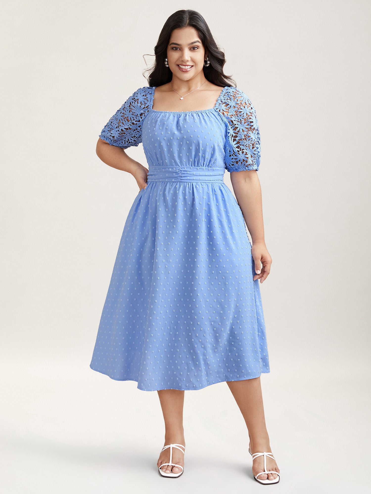• Textured Lace Sleeve Stretchy Waist Midi Dress