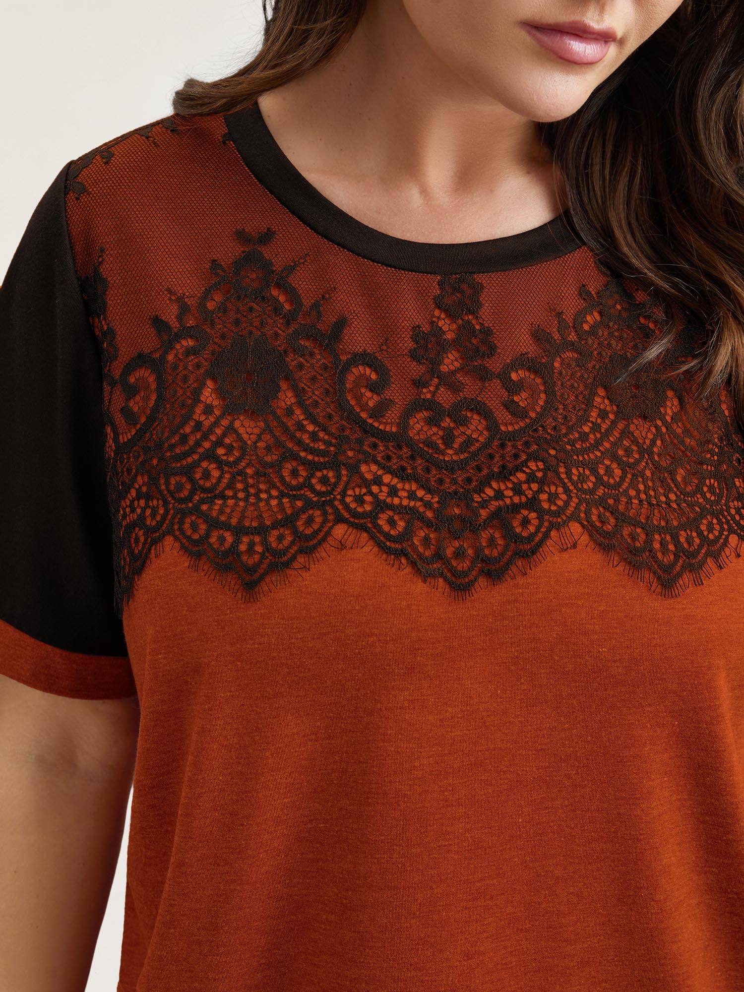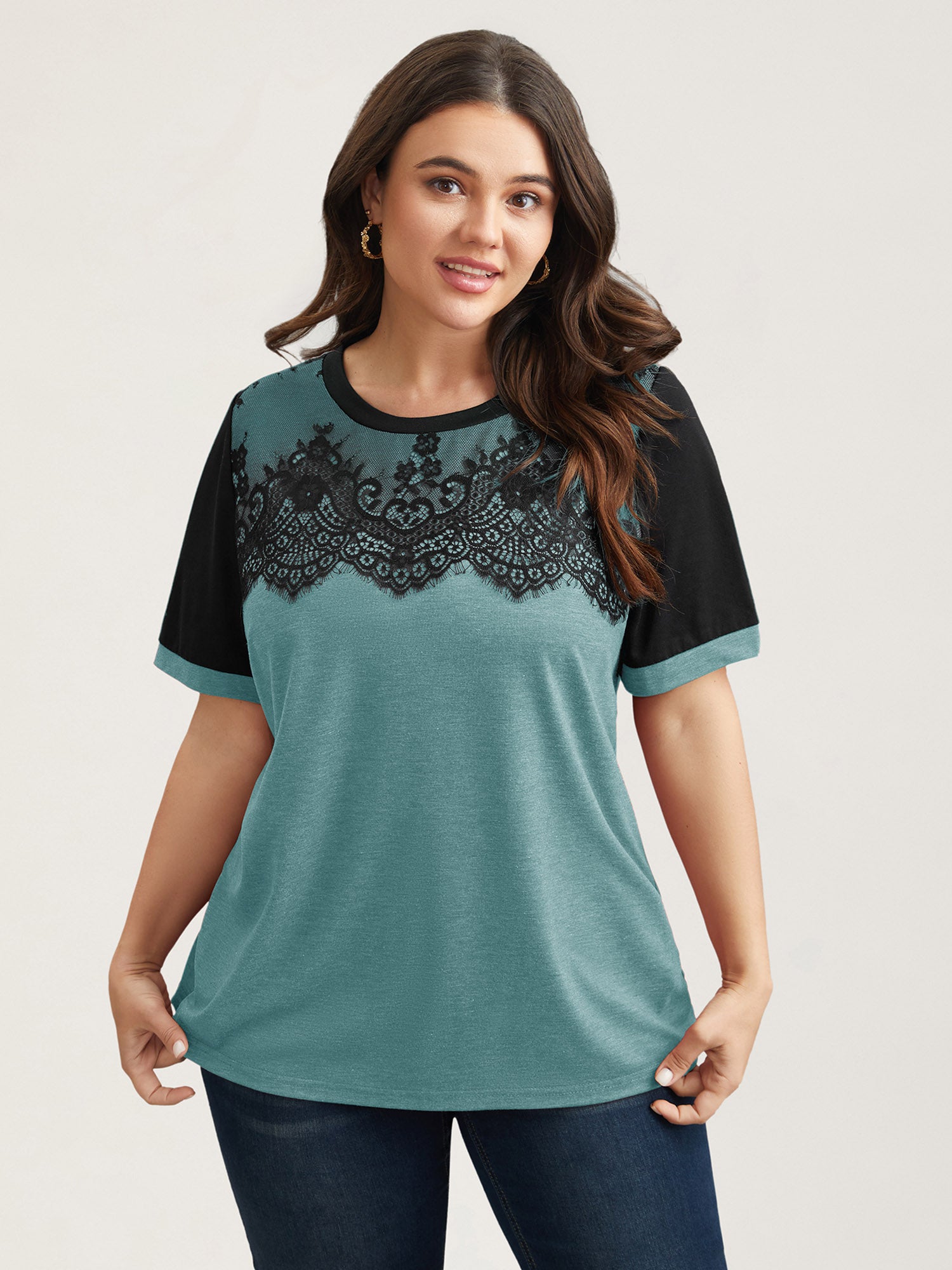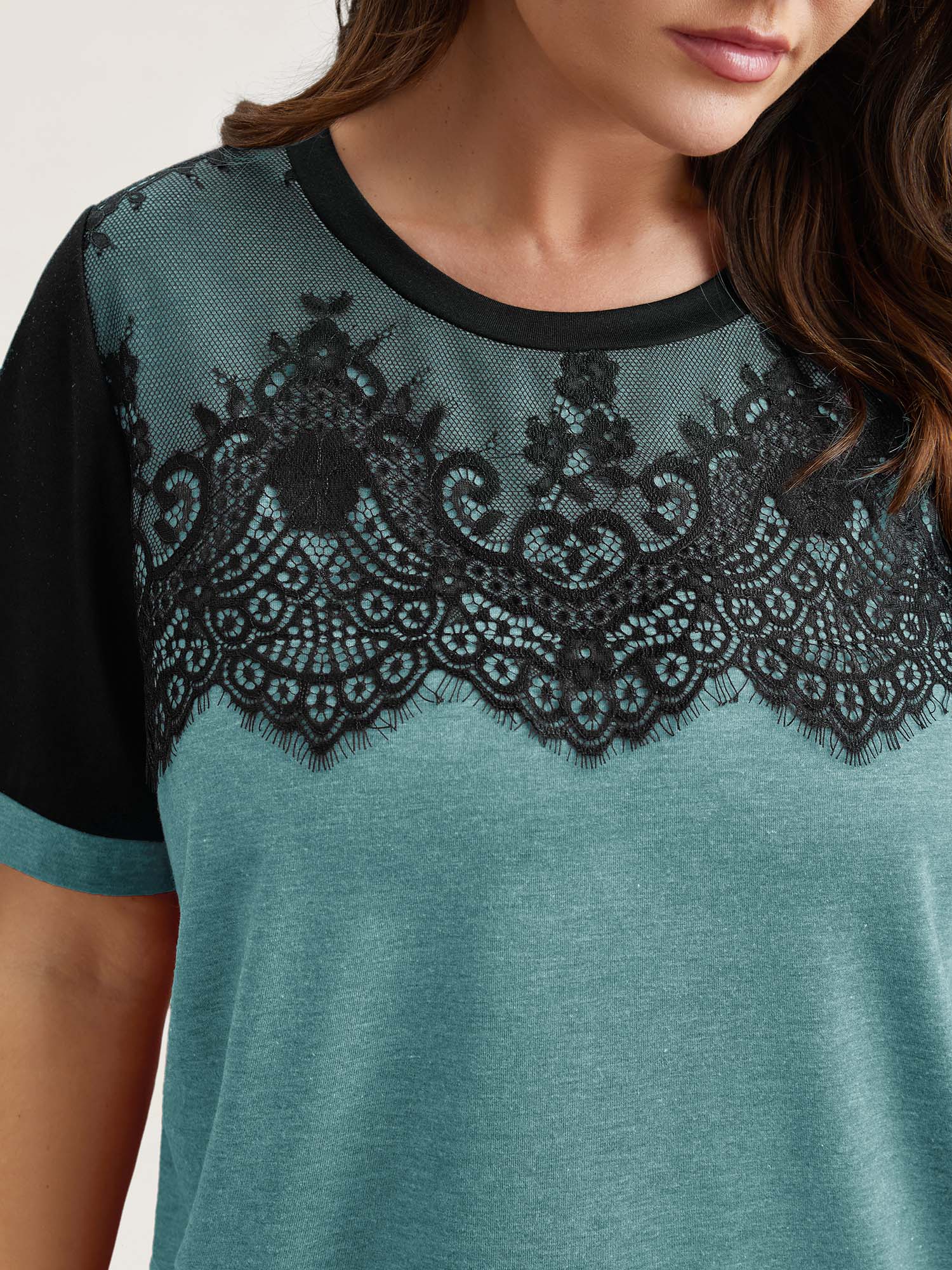Stretchy Scalloped Lace Color Contrast T-Shirt