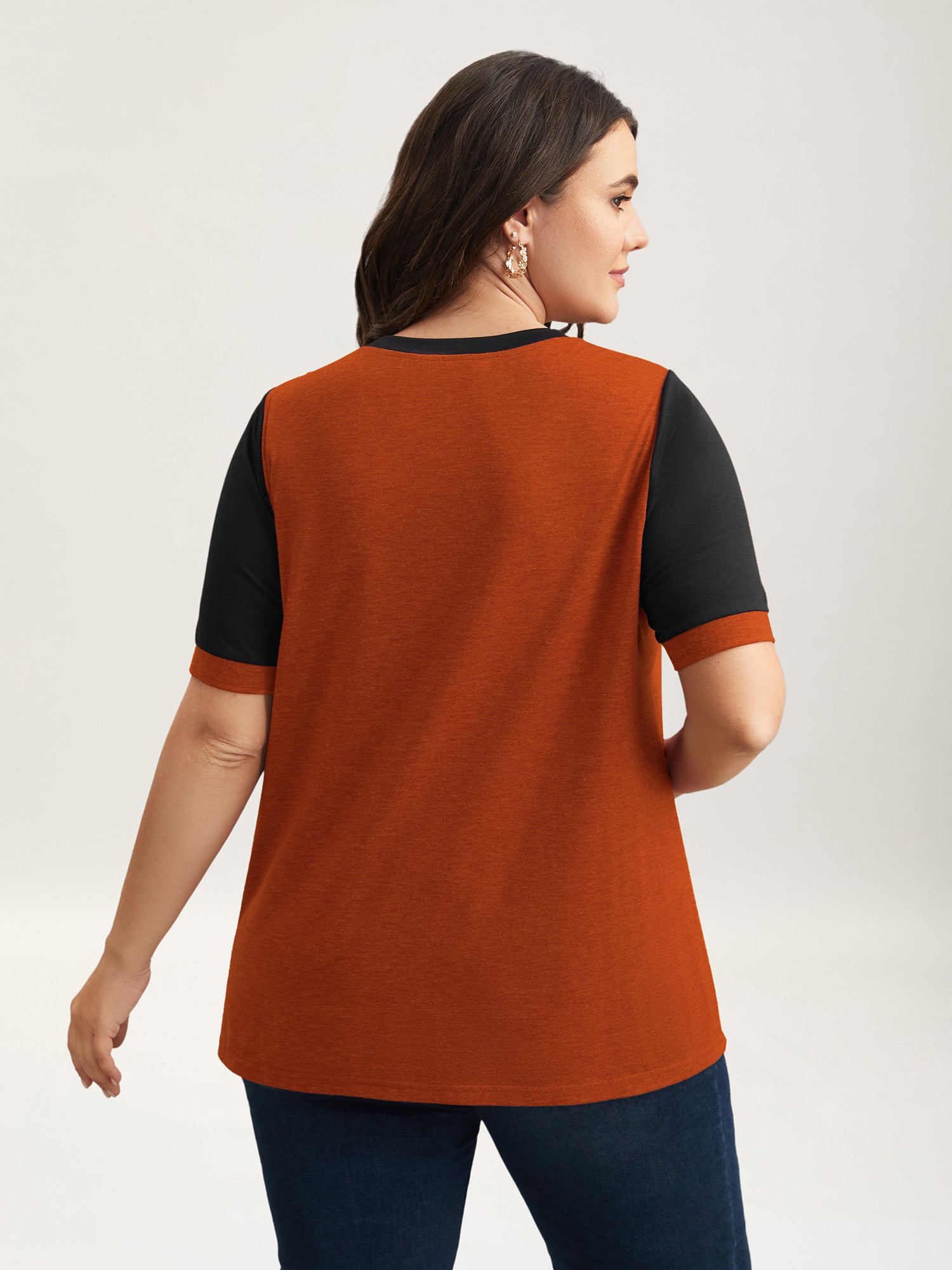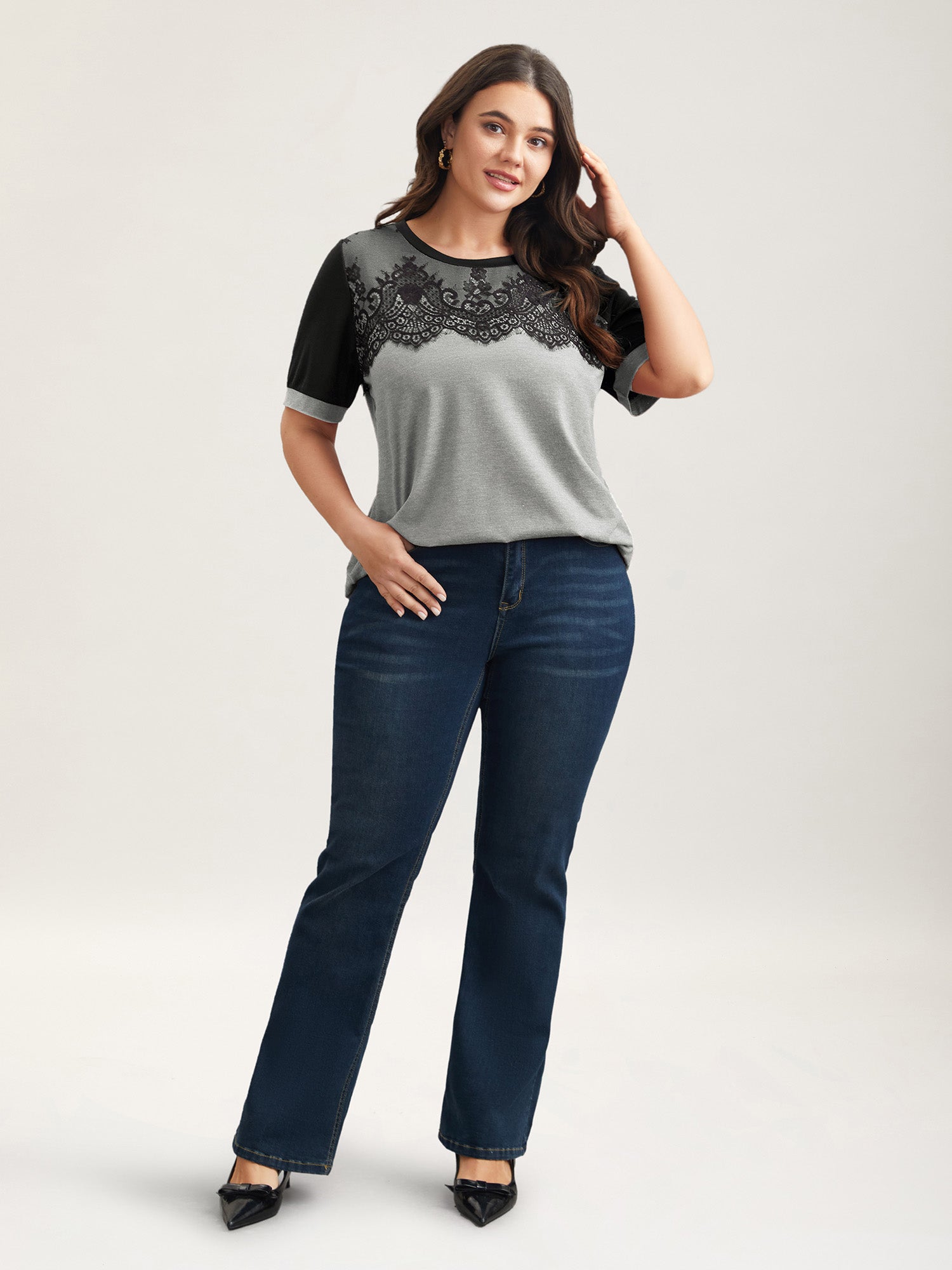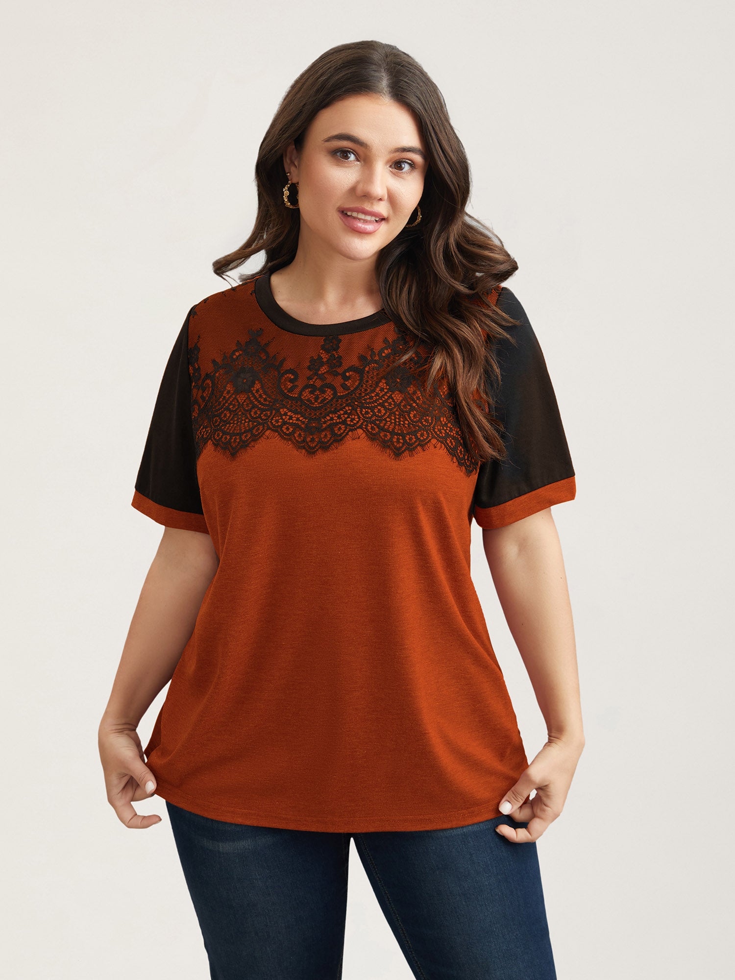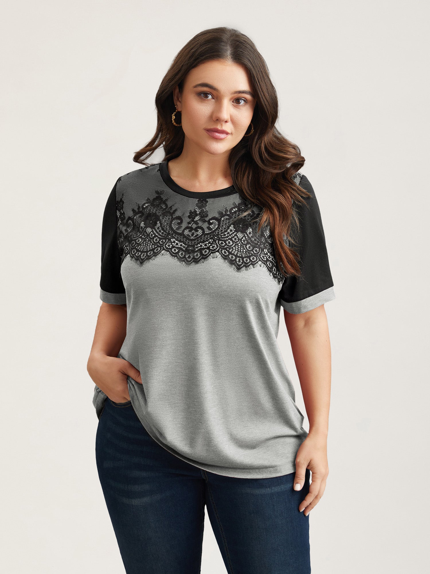 Stretchy Scalloped Lace Color Contrast T-Shirt