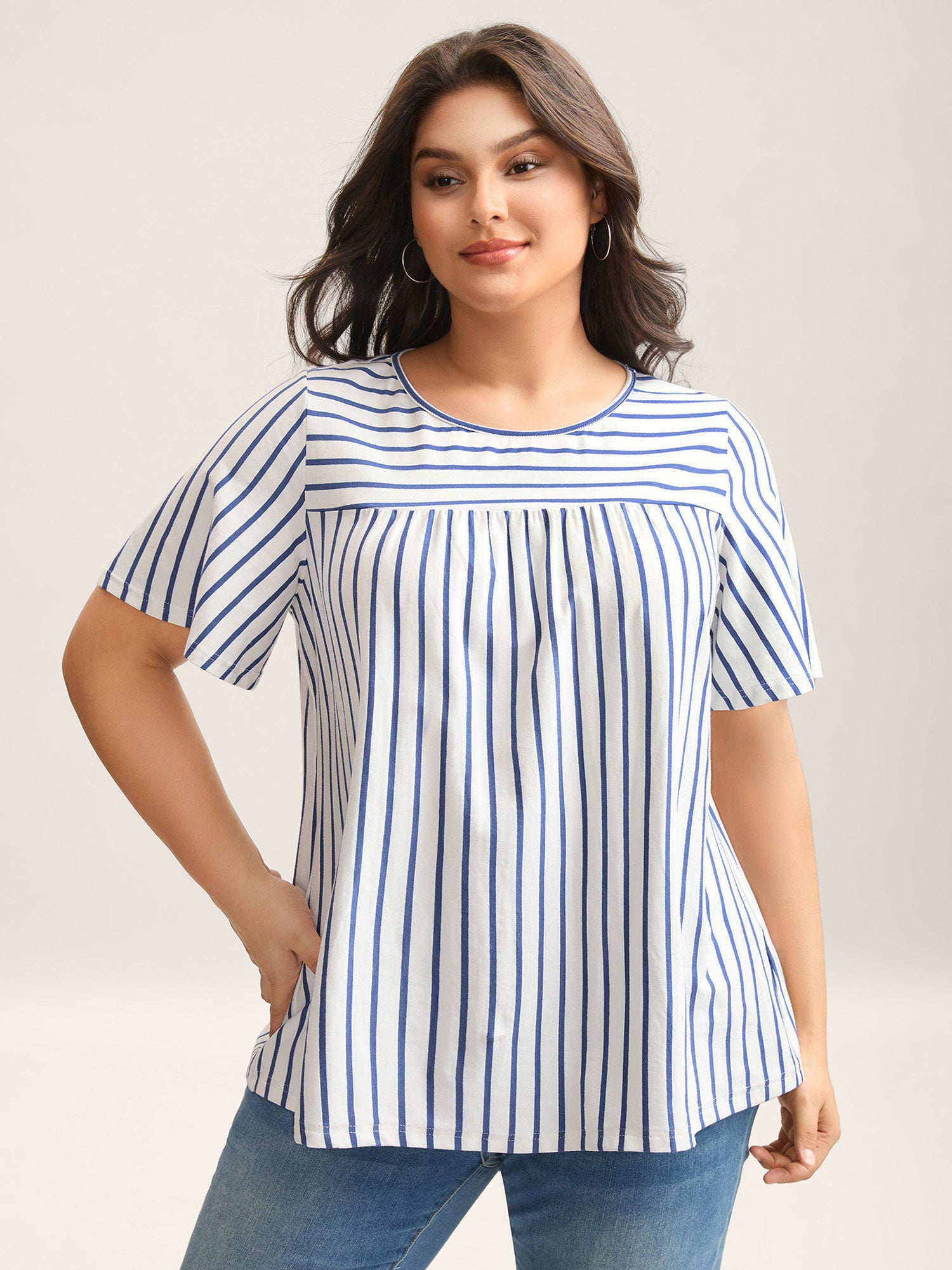 Colored Striped Crew Neck Batwing Sleeve T-shirt