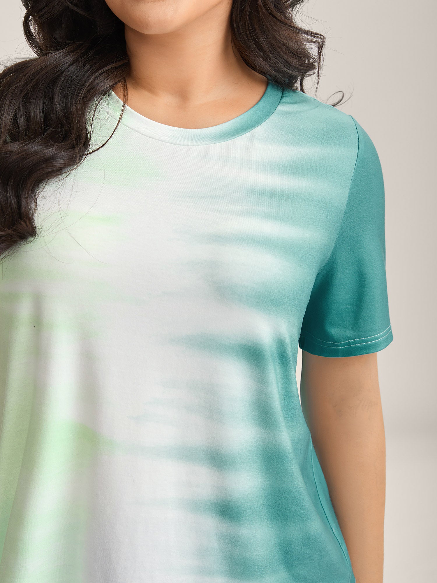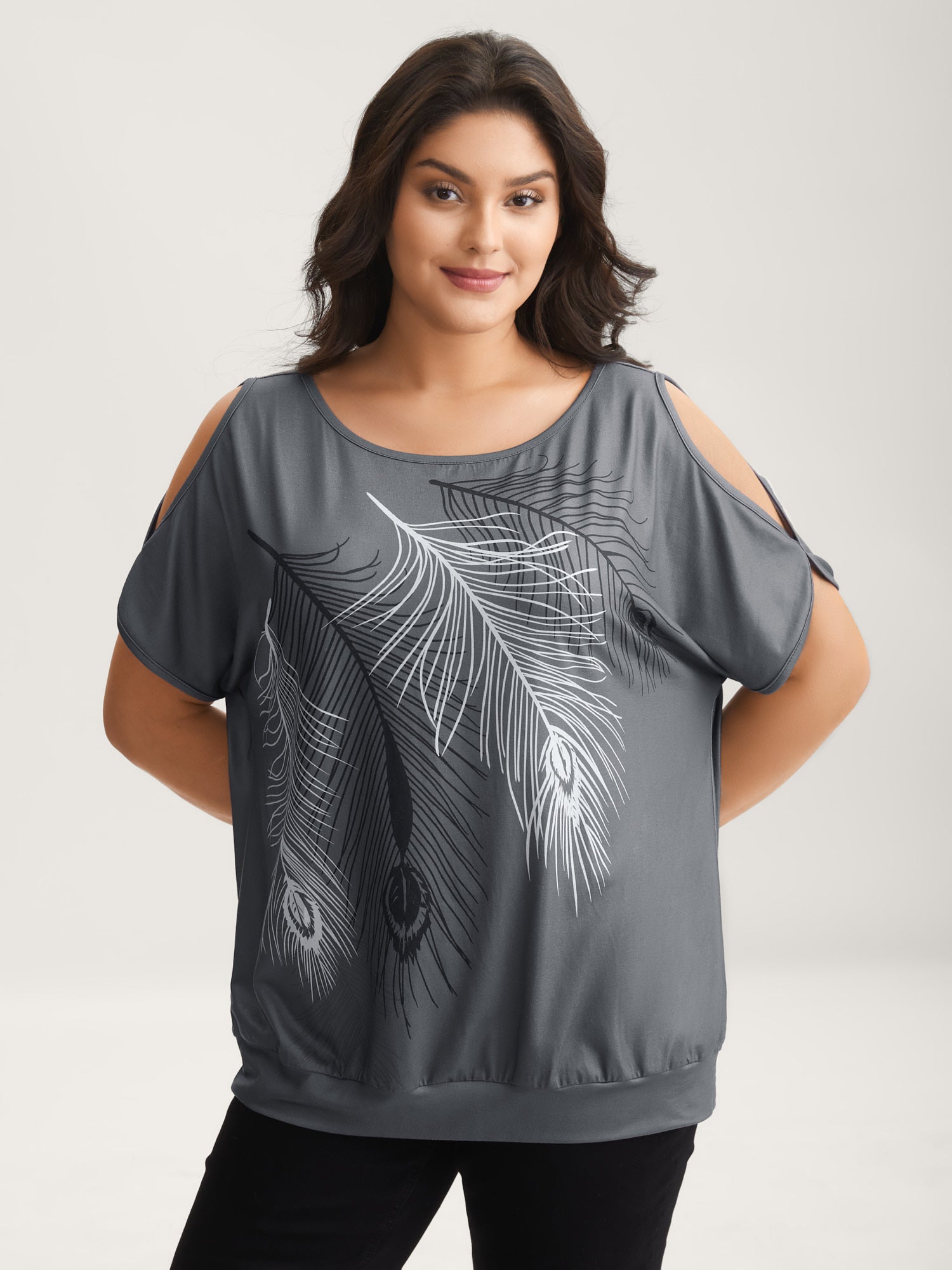 Stretchy Feather Print Cut-Out Sleeve T-Shirt