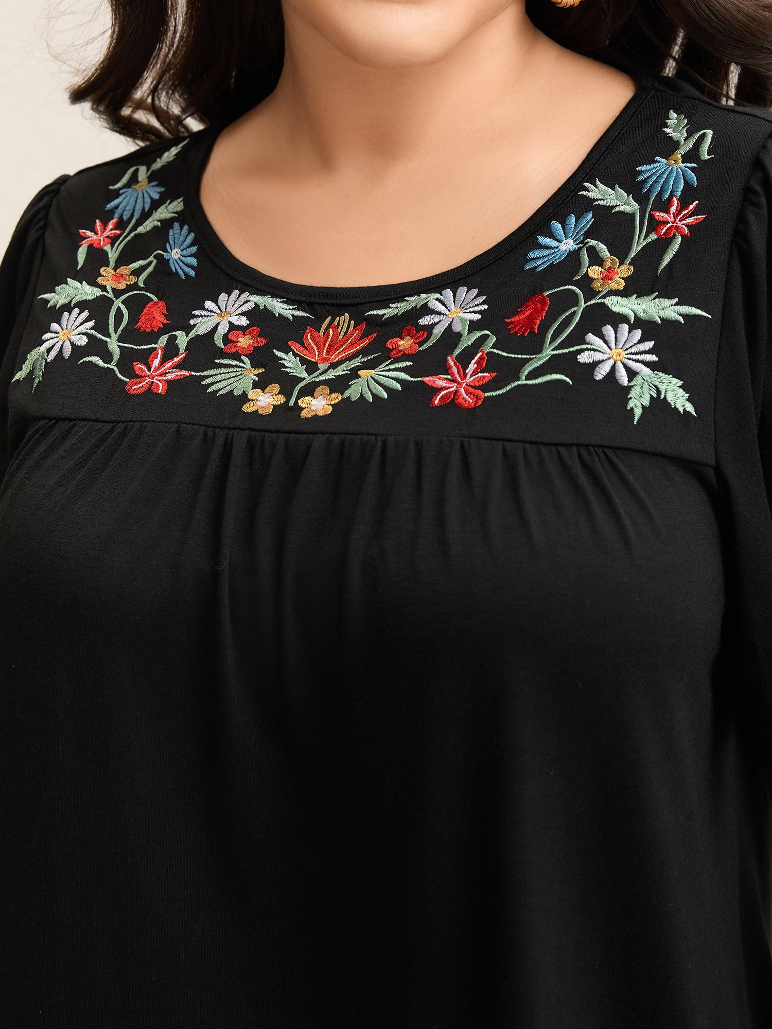 Embroidered Neckline Pleated Knit Top