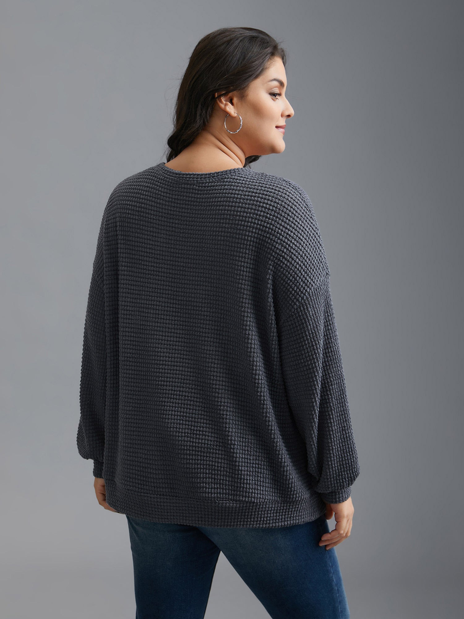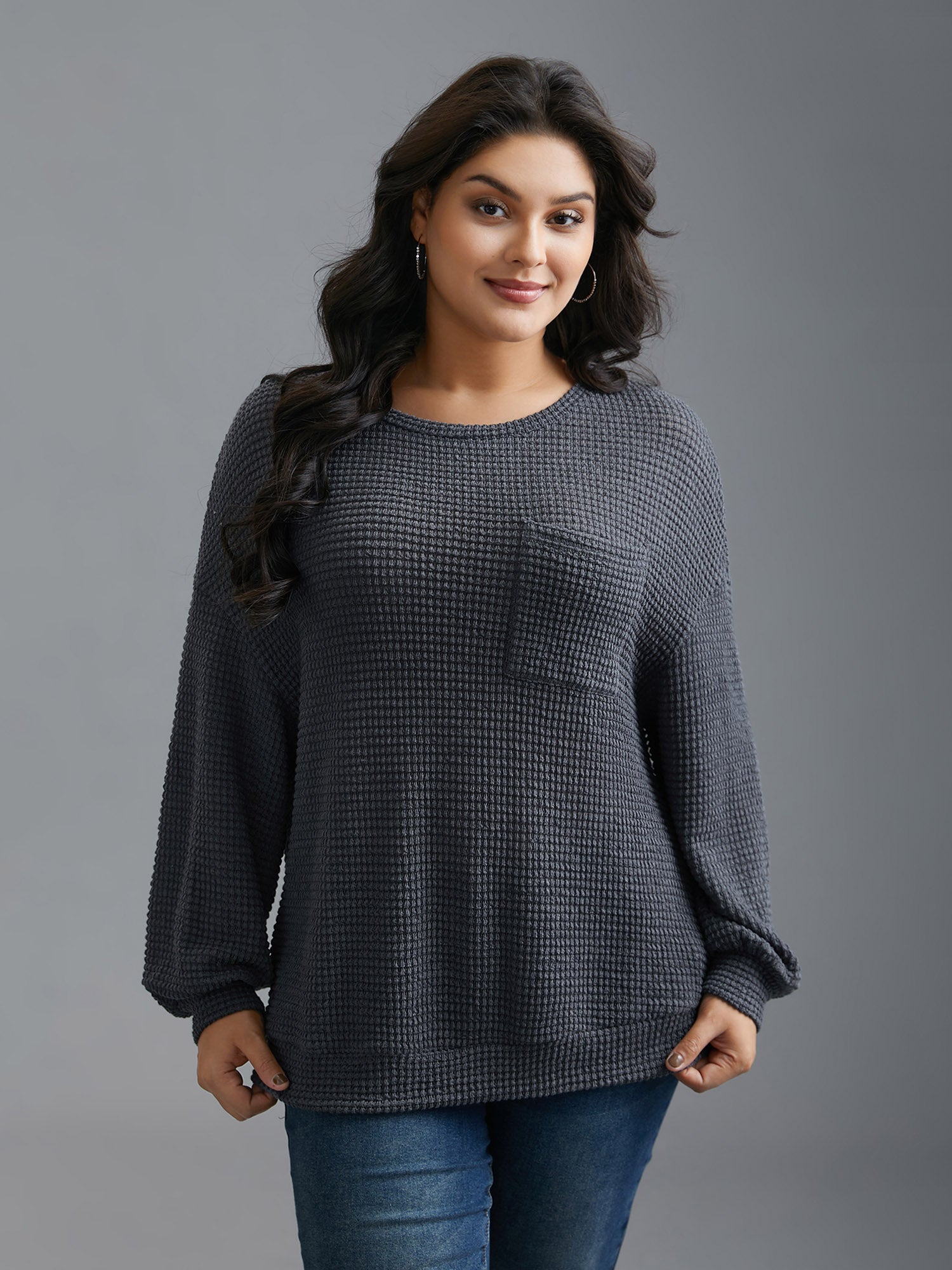 Round Neck Waffle Knit Patched Pocket Top