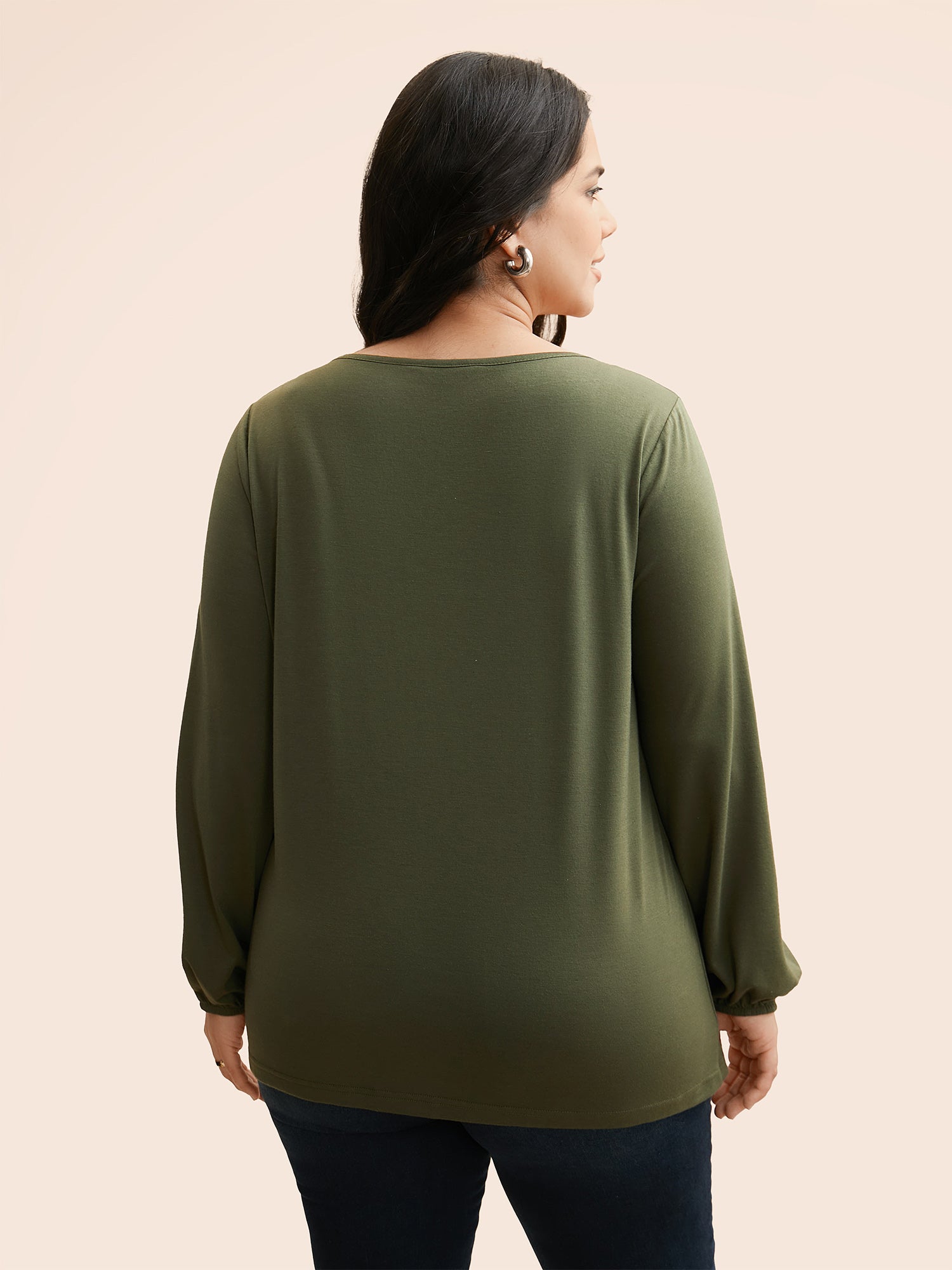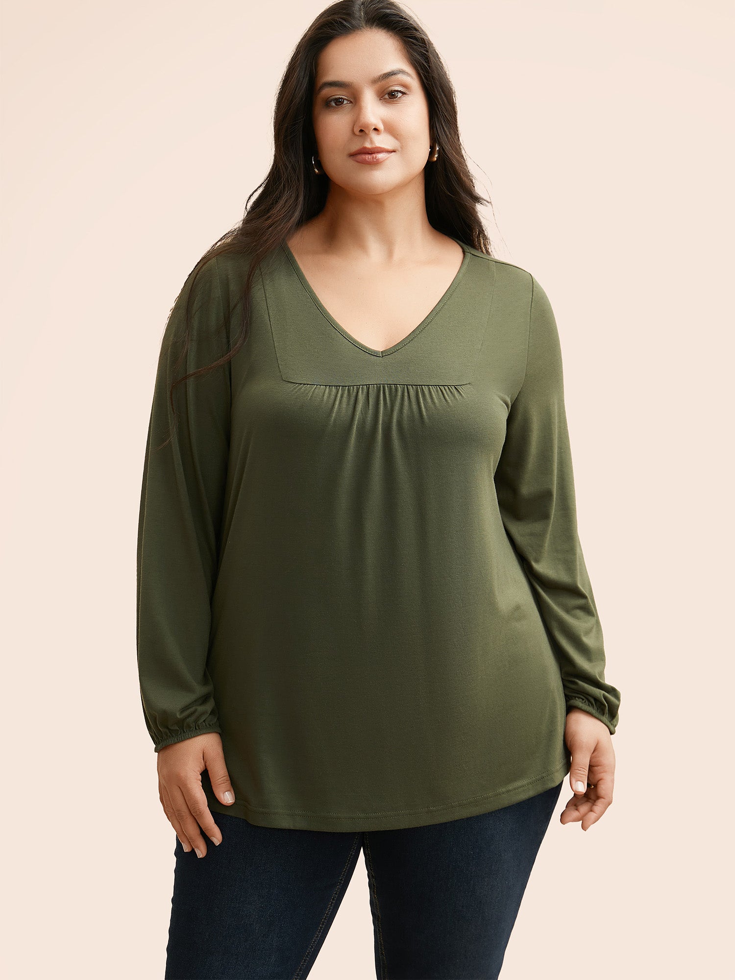 V Neck Gathered Lantern Sleeve Jersey Top
