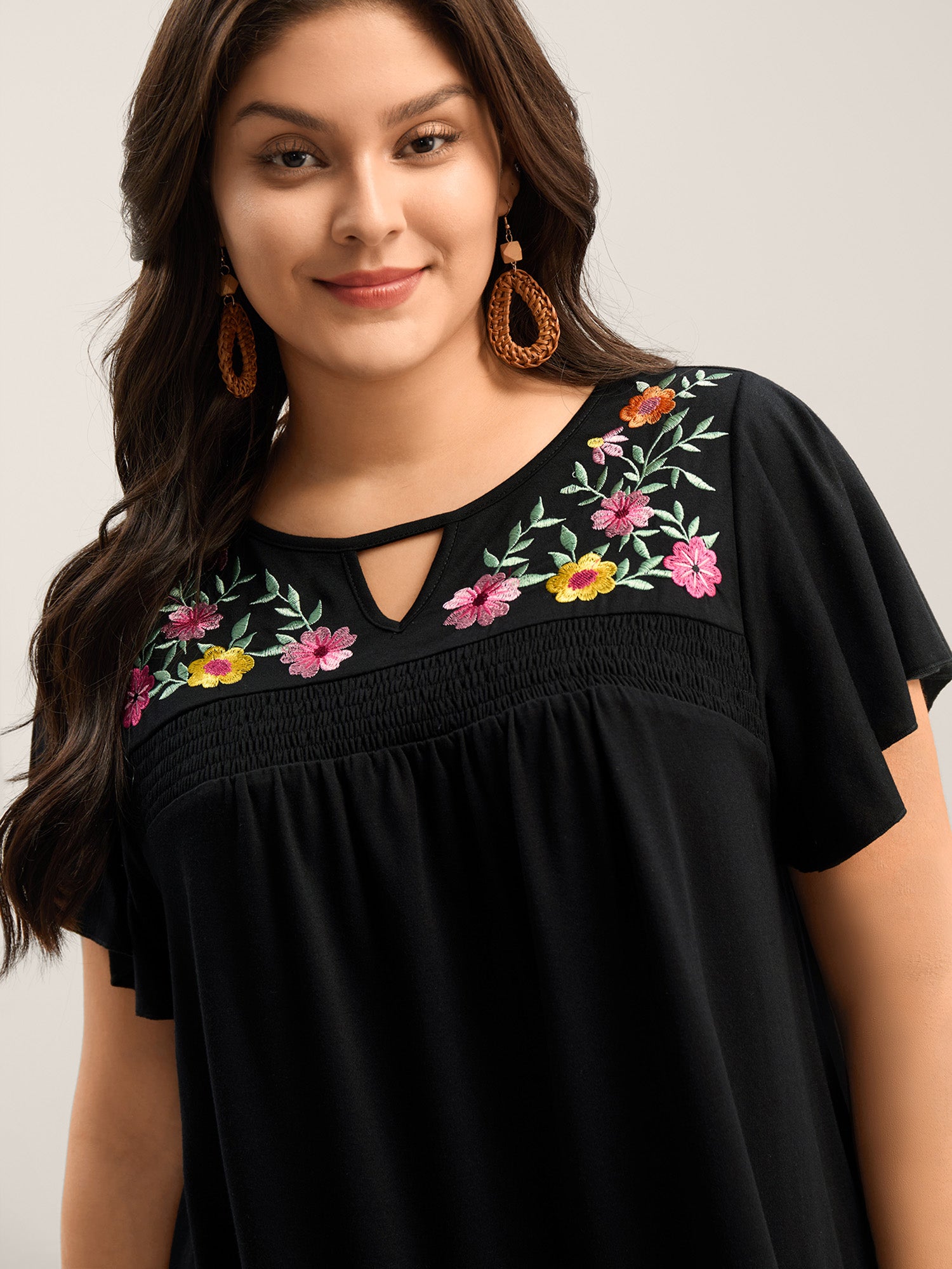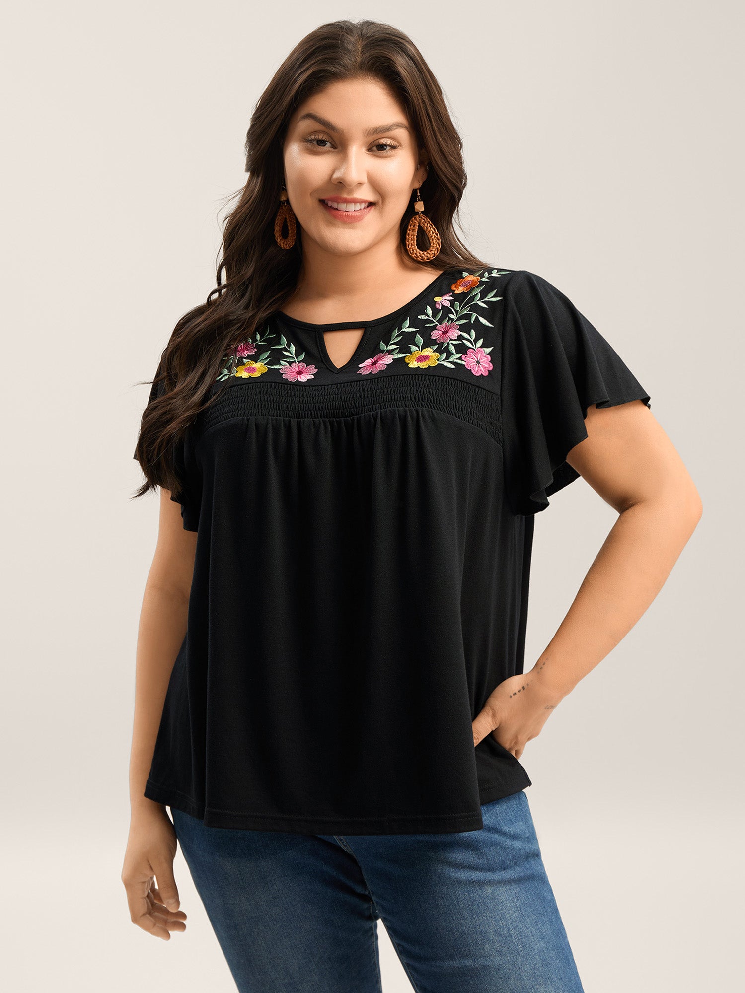 Floral Embroidered Neckline Flared Sleeve Top