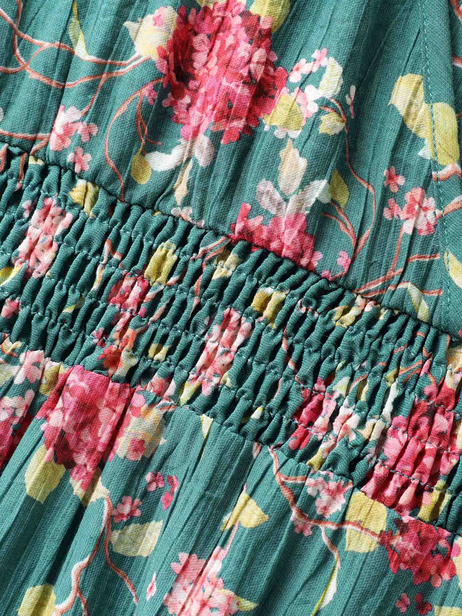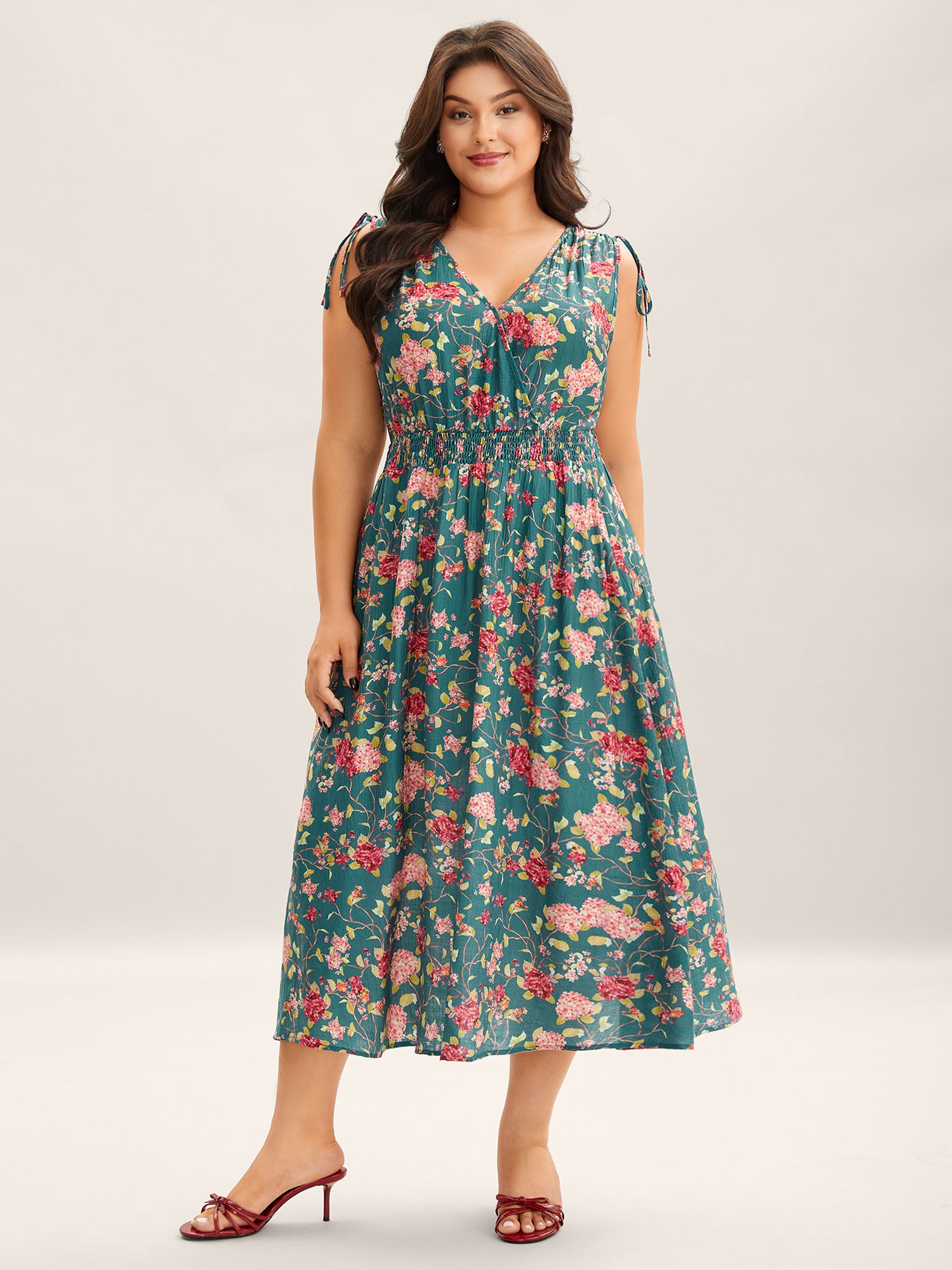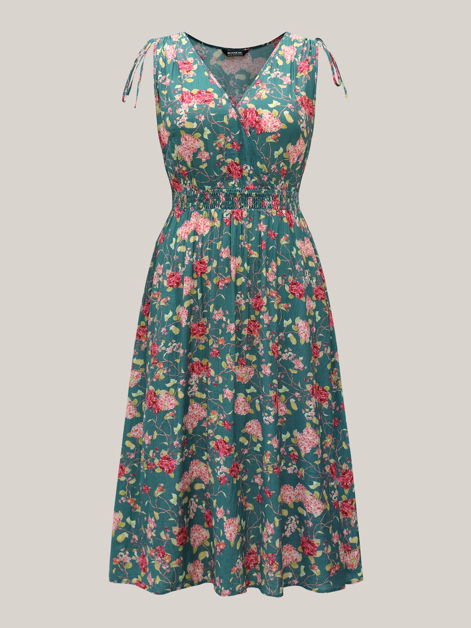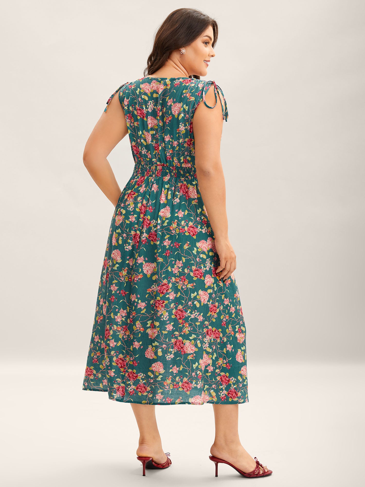 Floral Print Shoulder Tie Pockets Midi Dress