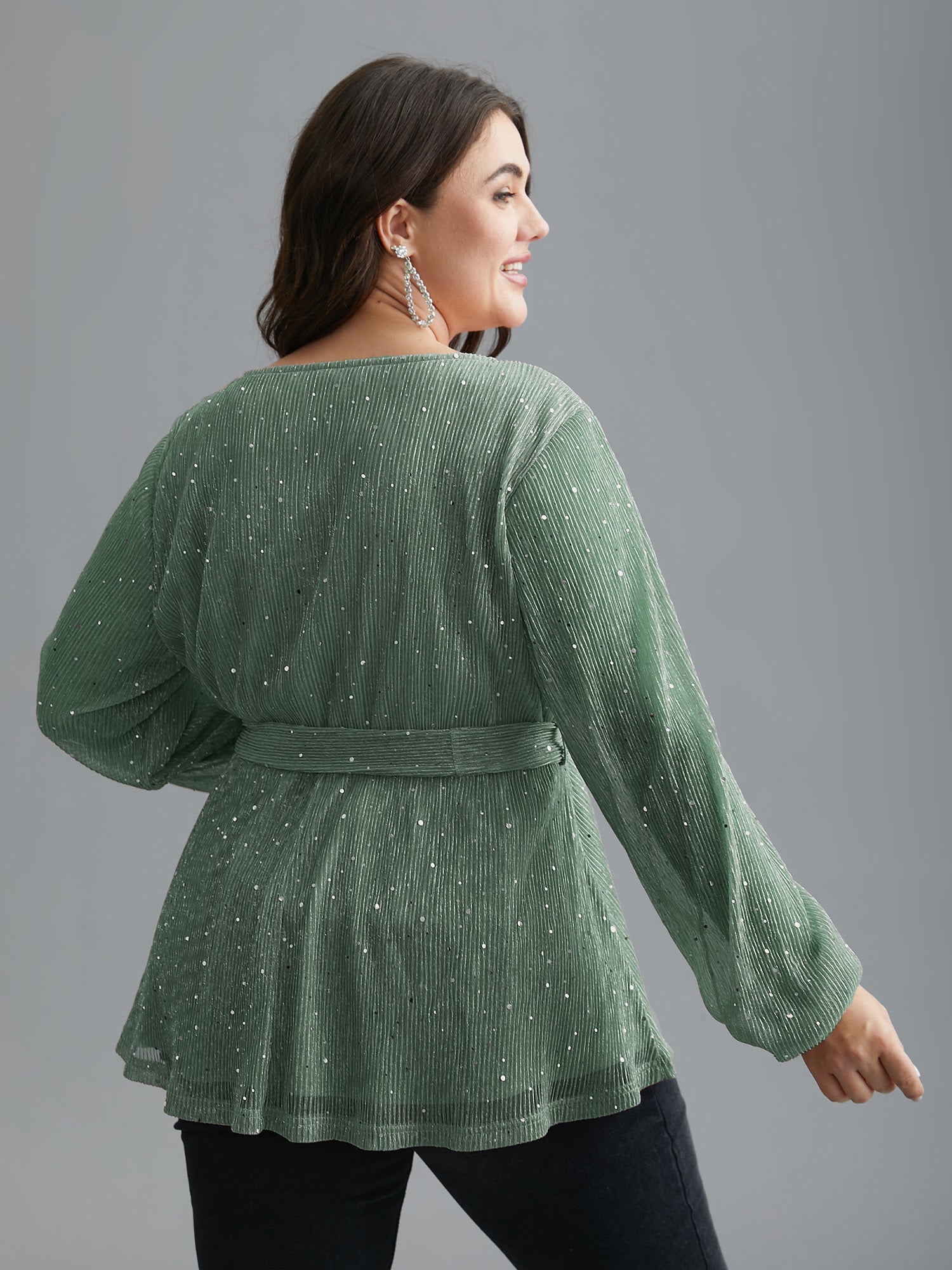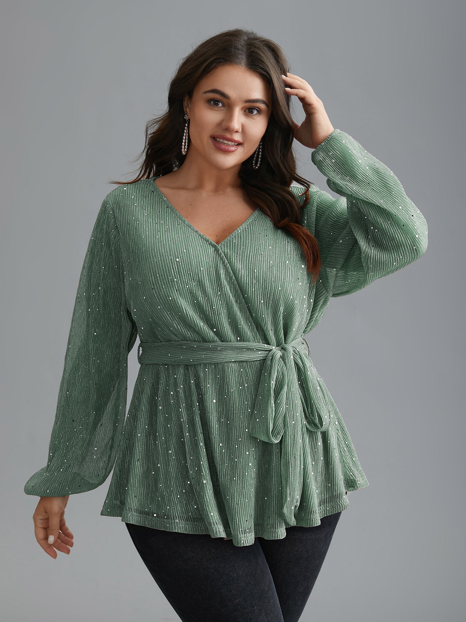 Sequin Mesh Lantern Sleeve Wrap Belted Striped Blouse